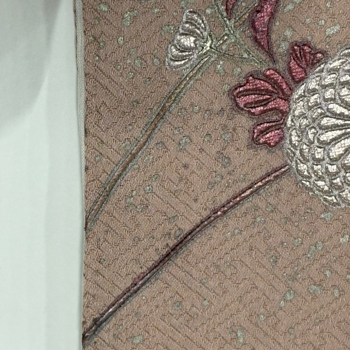 30%OFF 付下げ 身丈171cm 裄丈64.5cm M 袷 短冊 椿 金銀彩 ぼかし 茶緑色 正絹 秀品 K30