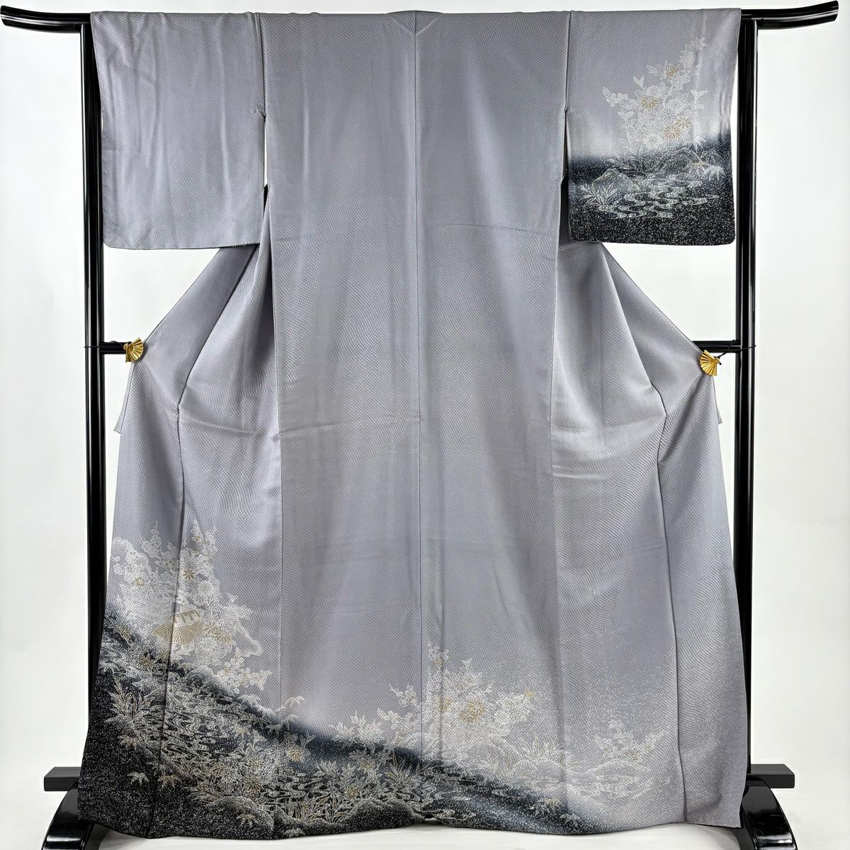 50%OFF 訪問着 身丈171cm 裄丈66.5cm M 袷 落款あり 草花 流水 金彩 灰紫 正絹 名品 K50