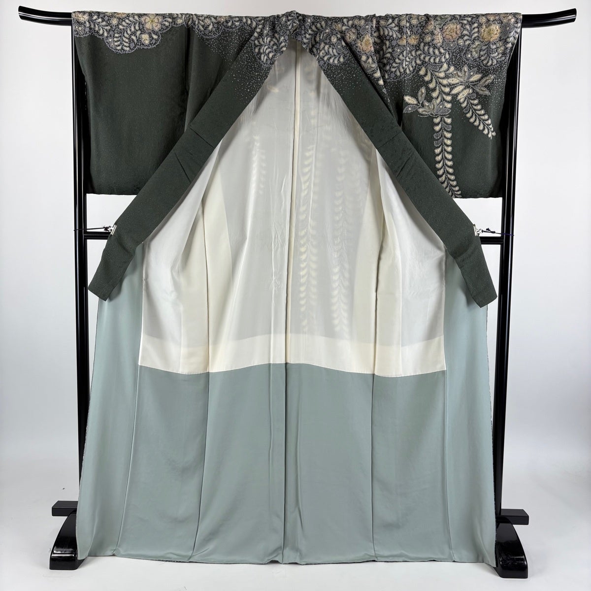 30%OFF 色留袖 身丈172.5cm 裄丈67cm M 袷 梅 桜 金彩 ぼかし 灰緑 正絹 名品 一つ紋 K30
