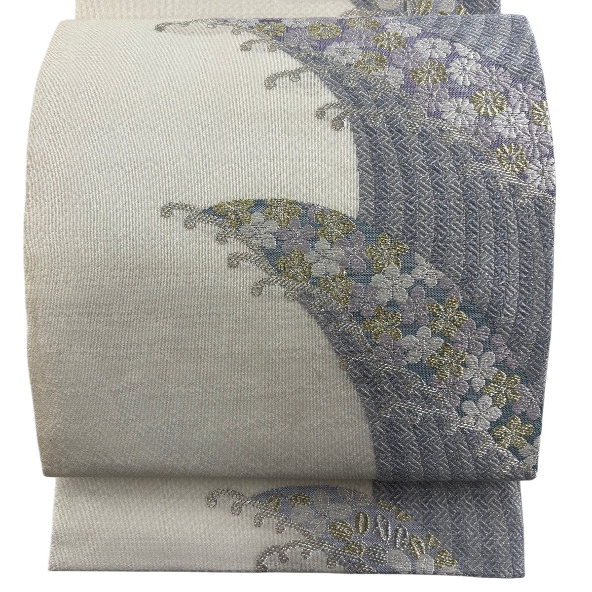 袋帯 秀品 関西仕立て 夏帯 紗 草花 芝 箔 灰色 六通 正絹