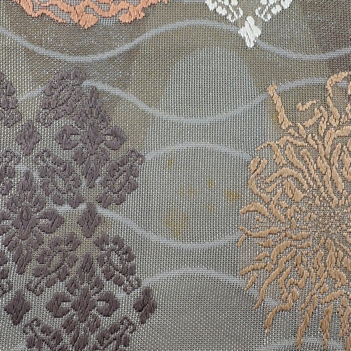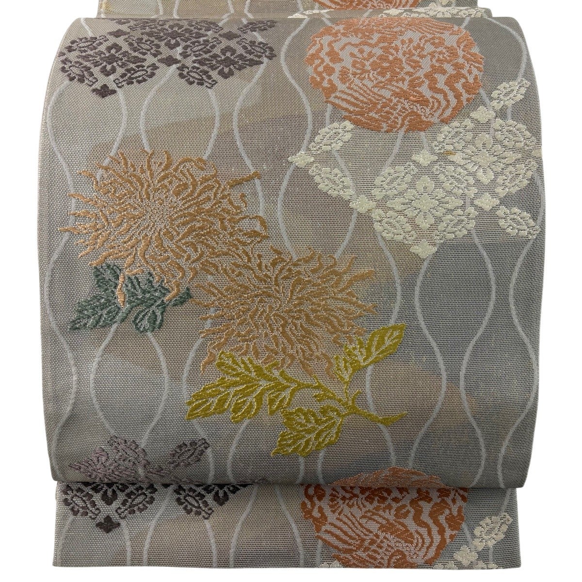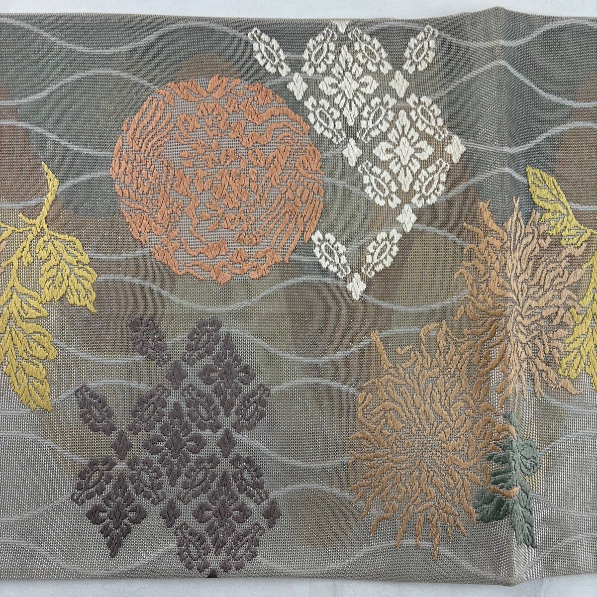 【美品】 袋帯 秀品 夏帯 紗 鈴乃屋 菊 刺繍 灰色 六通 正絹