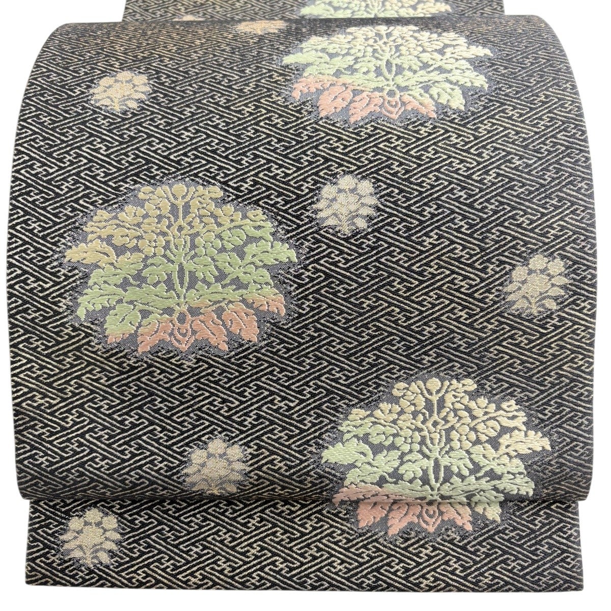 【美品】 袋帯 名品 天平唐花文錦文様 紗綾形 刺繍 箔 墨色 六通 正絹