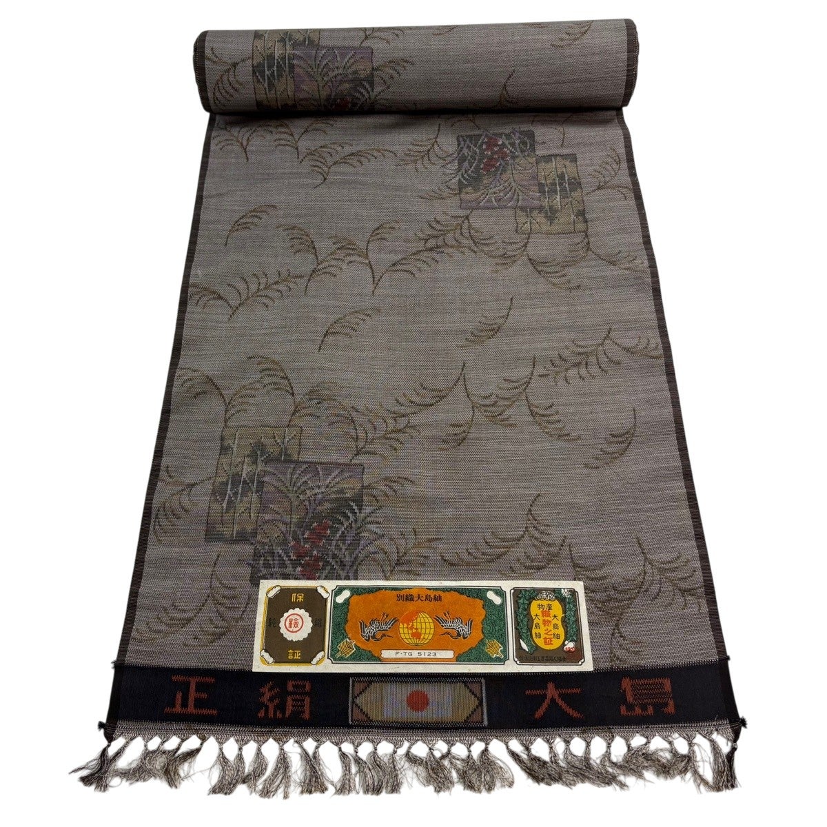 反物 秀品 紬 証紙 草花 幾何学 焦茶色 正絹