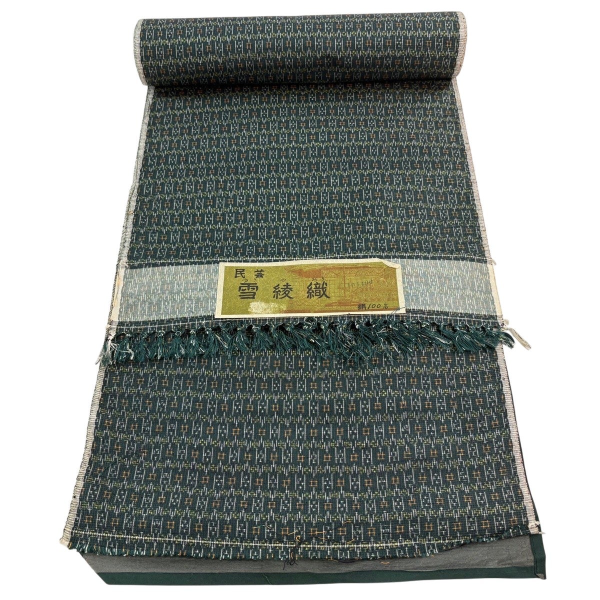 反物 秀品 紬 証紙 雪綾織 井桁絣 絣柄 深緑 正絹
