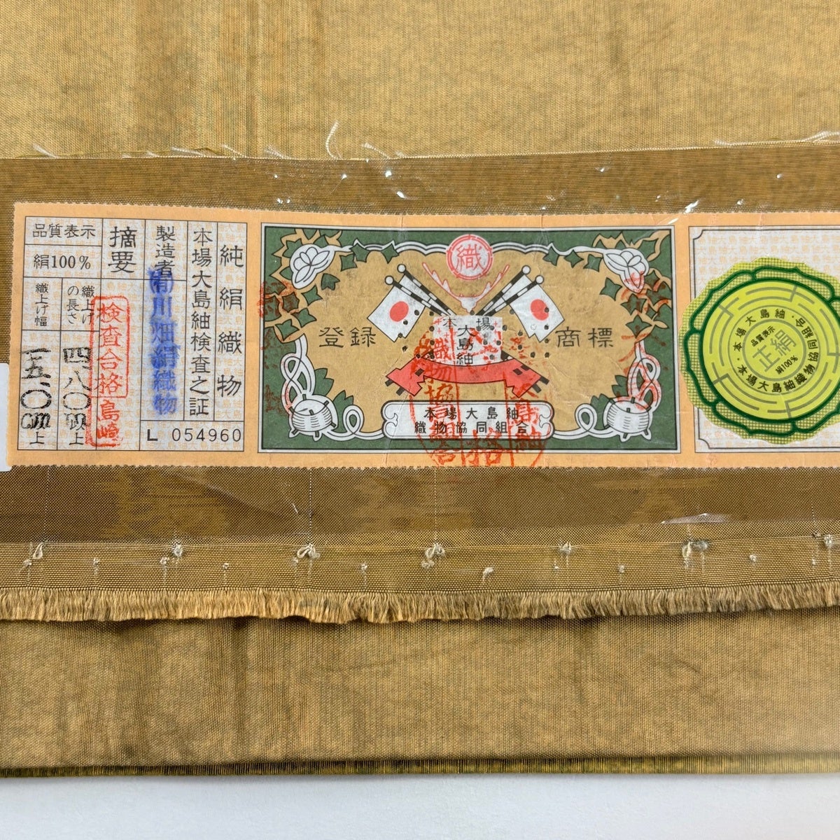 【在庫一掃】 袋帯 名品 証紙あり 大島紬地 花 霞 絞り 金彩 黄土色 お太鼓柄 正絹