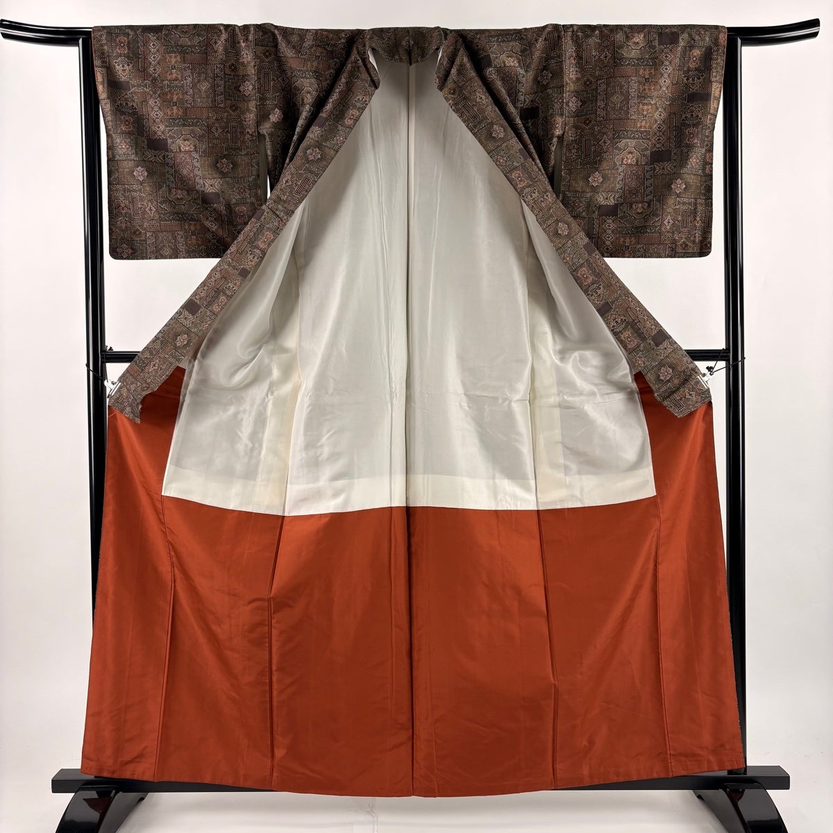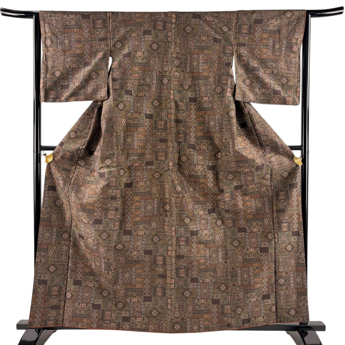 【美品】 紬 身丈161cm 裄丈63cm S 袷 菱 花 焦茶色 正絹 秀品