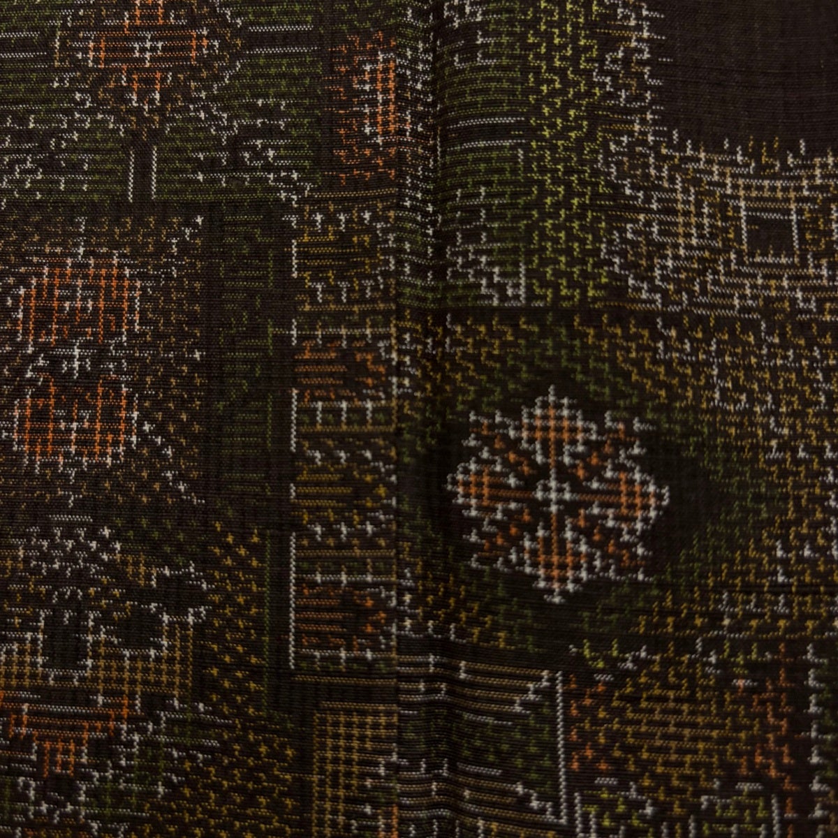 紬 身丈162cm 裄丈64cm M 袷 花菱 幾何学模様 茶緑色 正絹 秀品