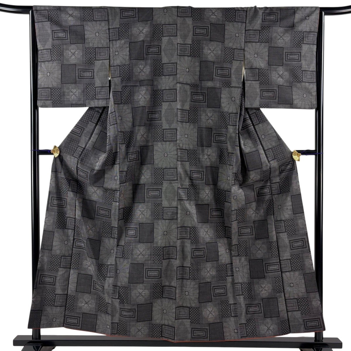 紬 身丈156cm 裄丈64.5cm M 袷 菊 幾何学模様 黒灰 正絹 秀品