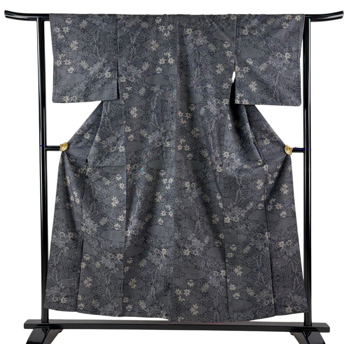 【美品】 紬 身丈155.5cm 裄丈62.5cm S 袷 草花 楓 墨色 正絹 優品