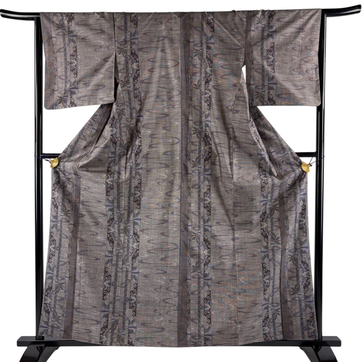 紬 身丈154cm 裄丈63.5cm S 単衣 天山紬 縞 華文 灰紫 正絹 秀品