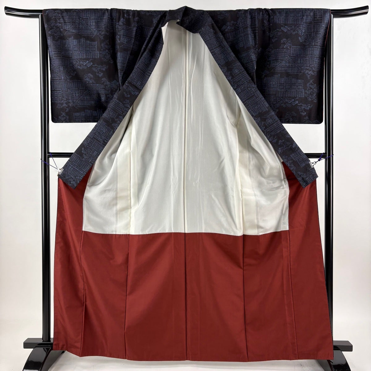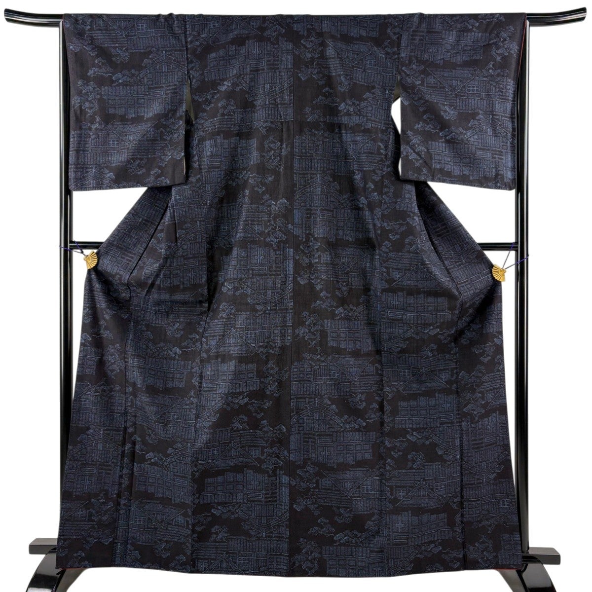 【美品】 紬 身丈166.5cm 裄丈65.5cm M 袷 建物 松 濃紺 正絹 秀品