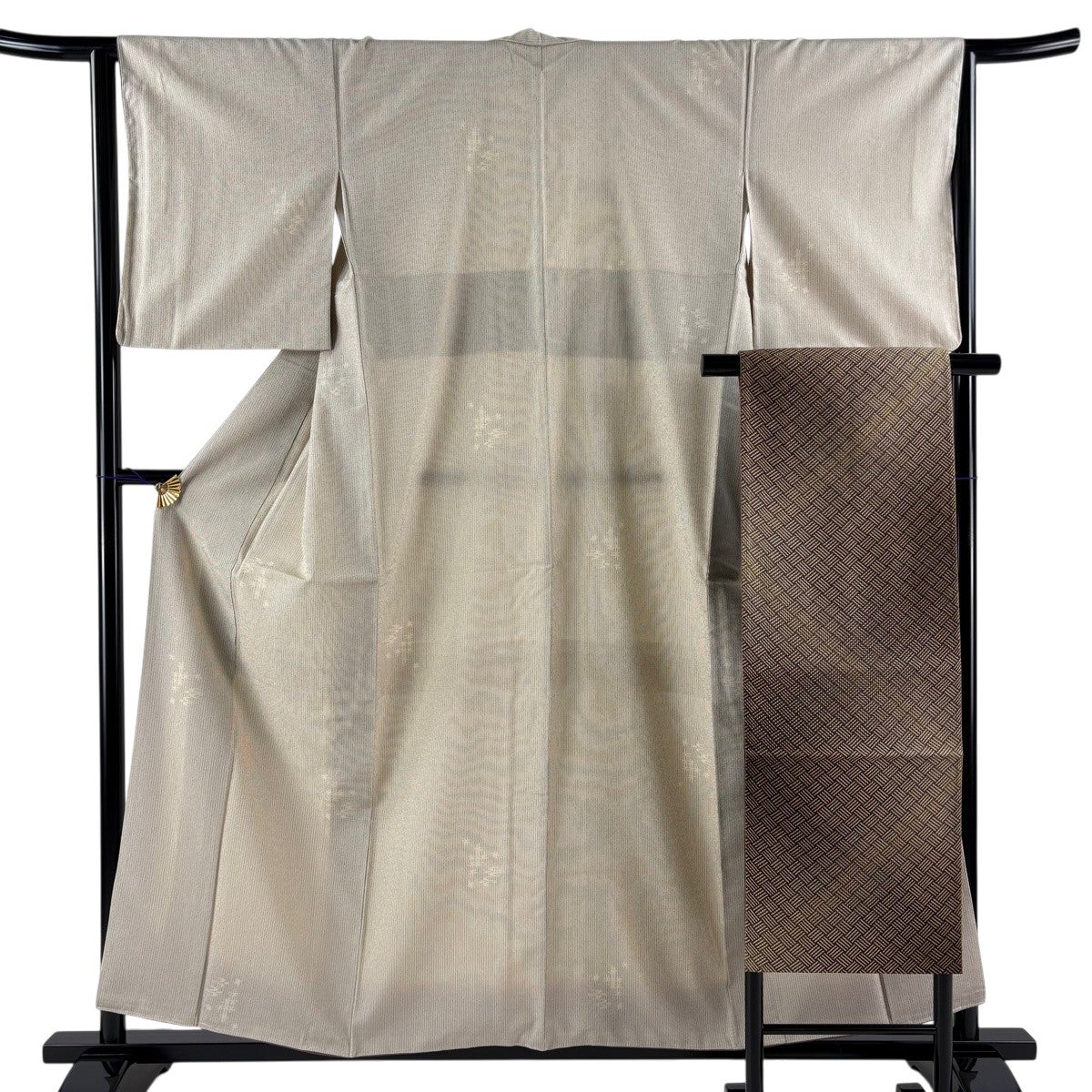 紬 身丈163cm 裄丈65.5cm M 薄物 夏紬 井桁絣 十字絣 ベージュ 正絹 秀品
