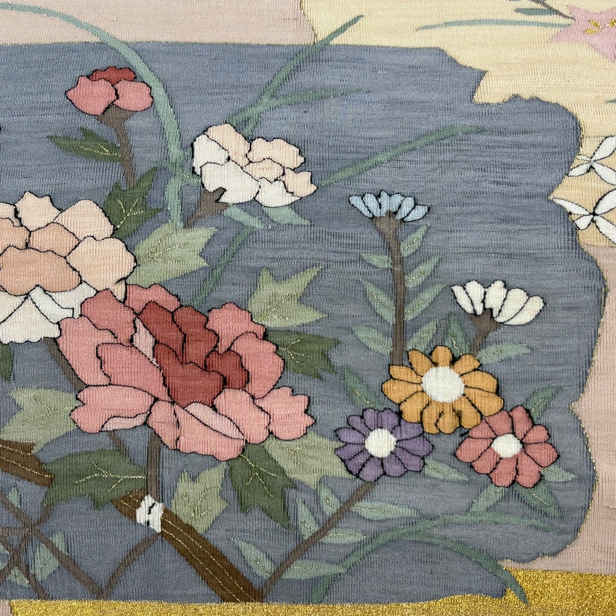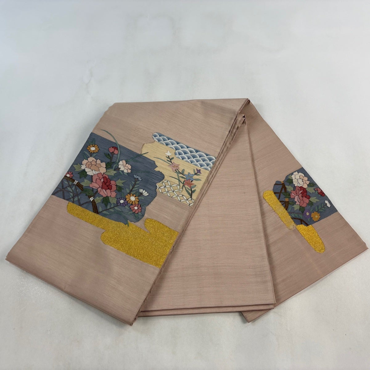 名古屋帯 秀品 紬地 草花 金彩 ぼかし ベージュ 正絹