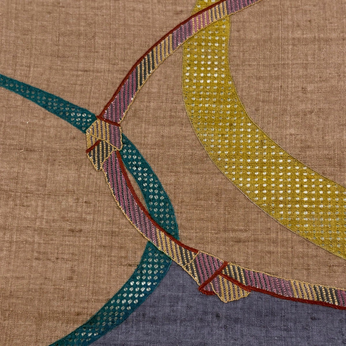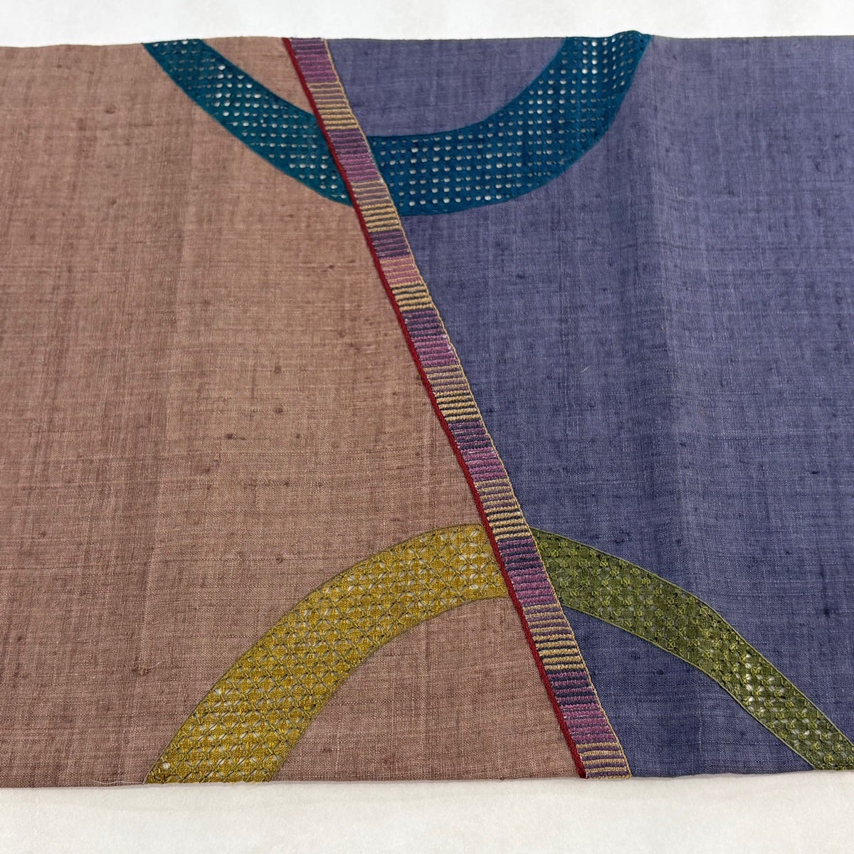 【美品】 名古屋帯 秀品 紬地 草花 幾何学 刺繍 相良刺繍 薄小豆 正絹