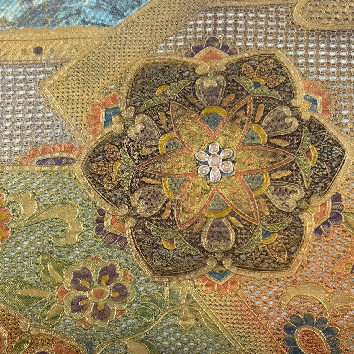 【美品】 袋帯 名品 紬地 辻が花柄 格子 箔 絞り 緑 お太鼓柄 正絹