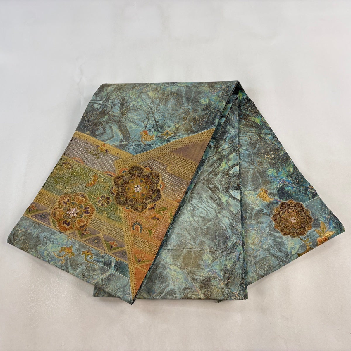 【美品】 袋帯 名品 紬地 花 幾何学模様 絞り ぼかし 鶯色 全通 正絹
