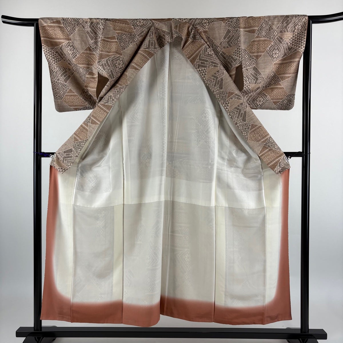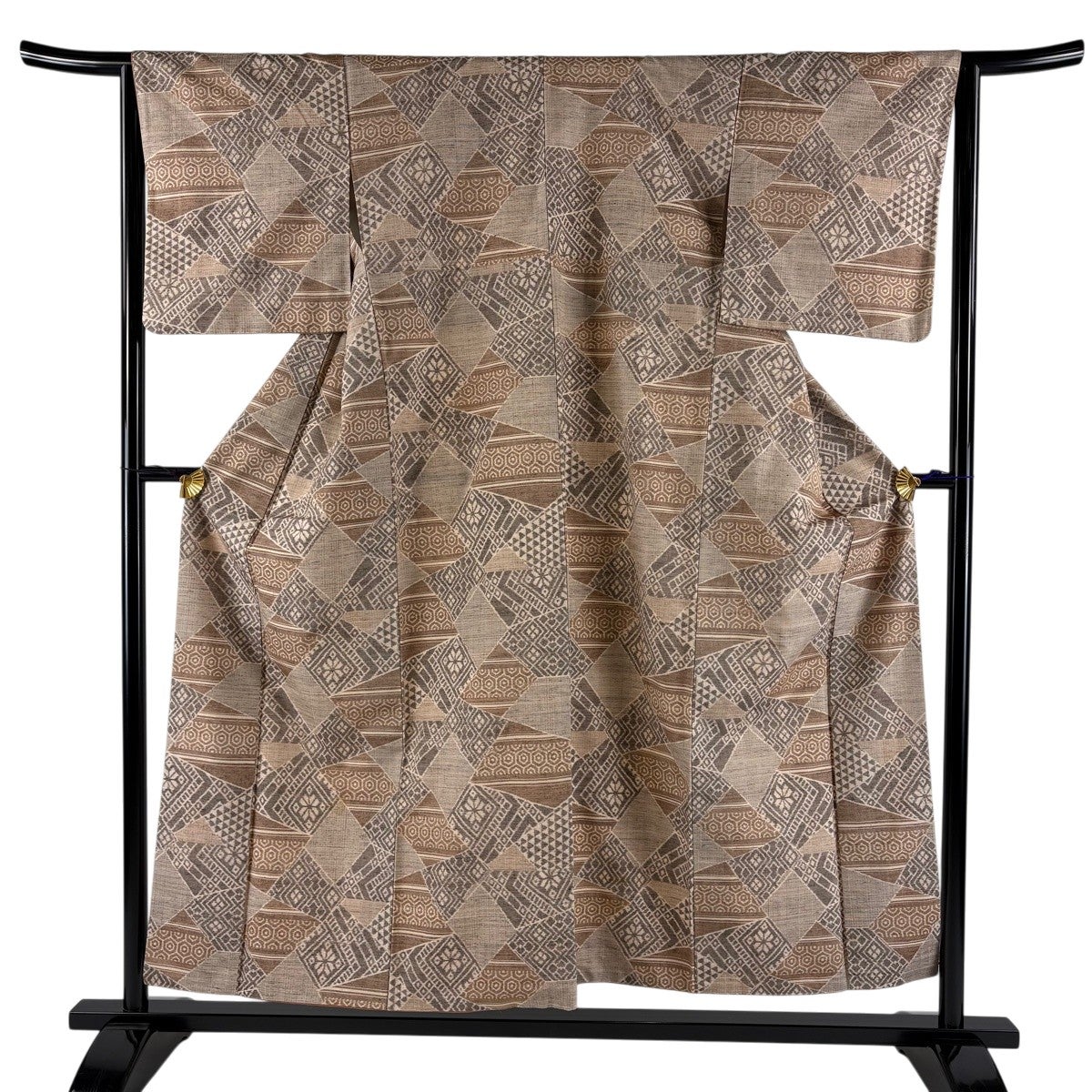 紬 身丈154.5cm 裄丈64.5cm M 袷 亀甲 菱 薄茶色 正絹 秀品