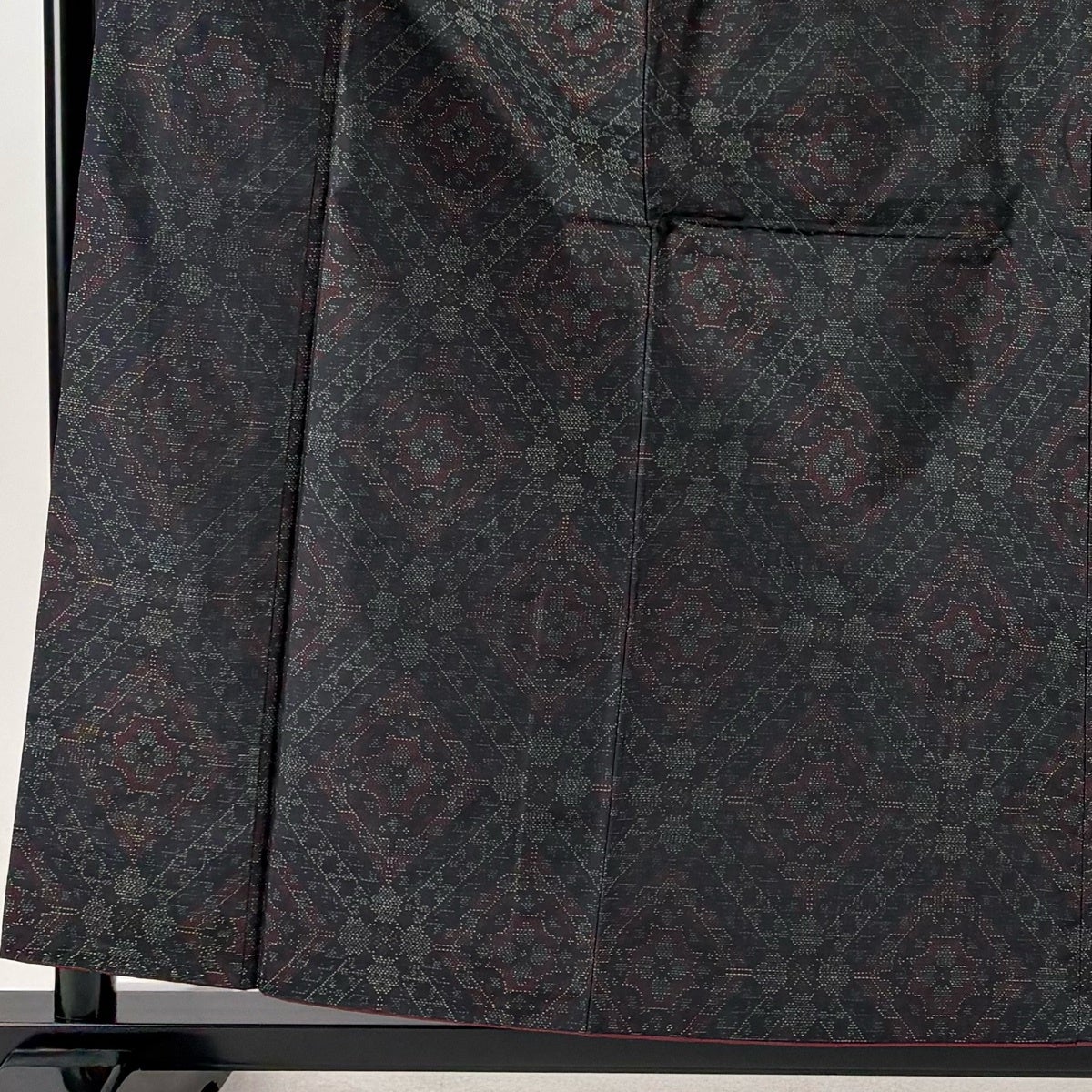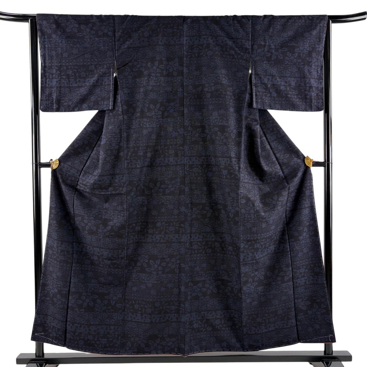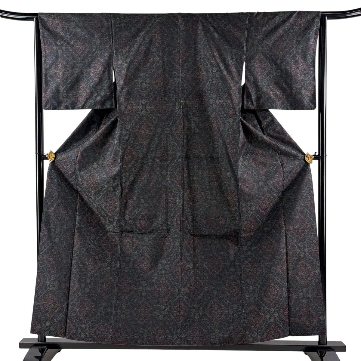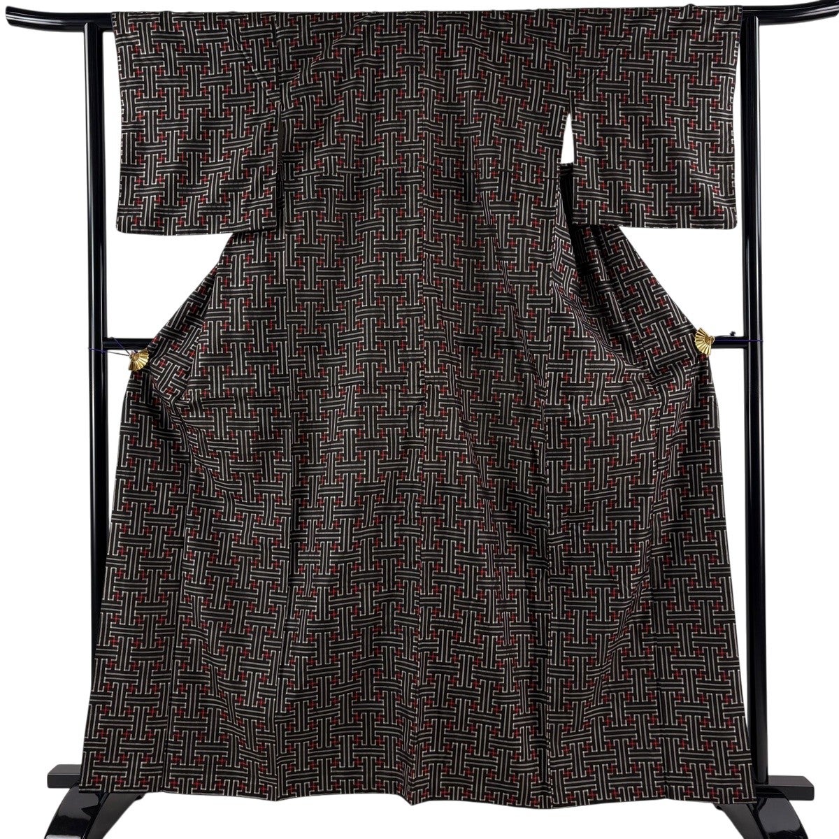紬 身丈151.5cm 裄丈63.5cm S 袷 幾何学模様 墨色 正絹 秀品