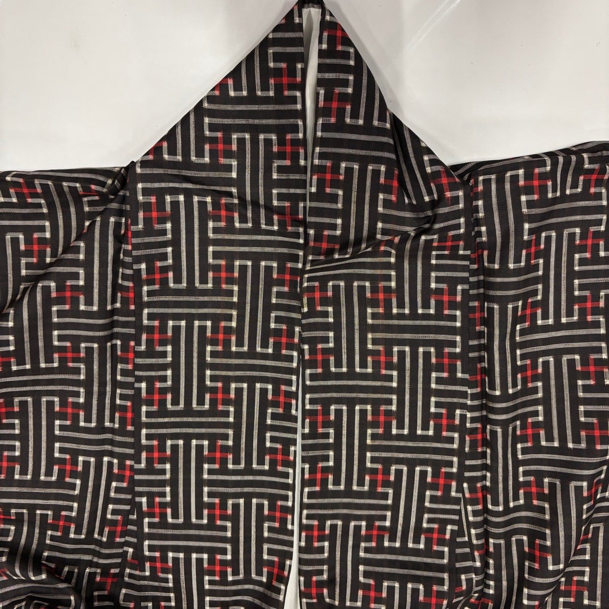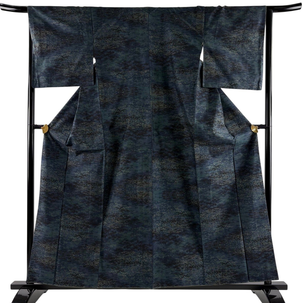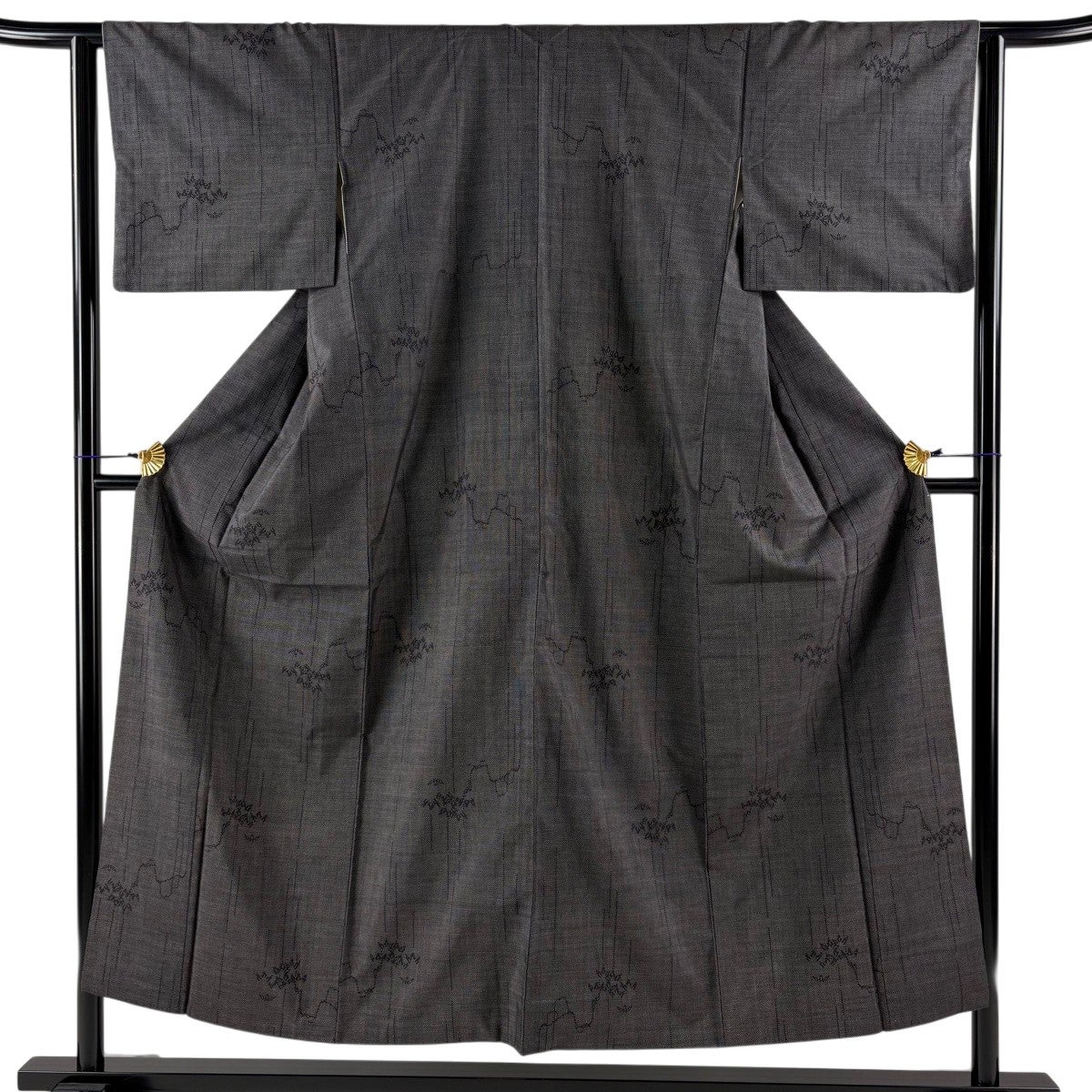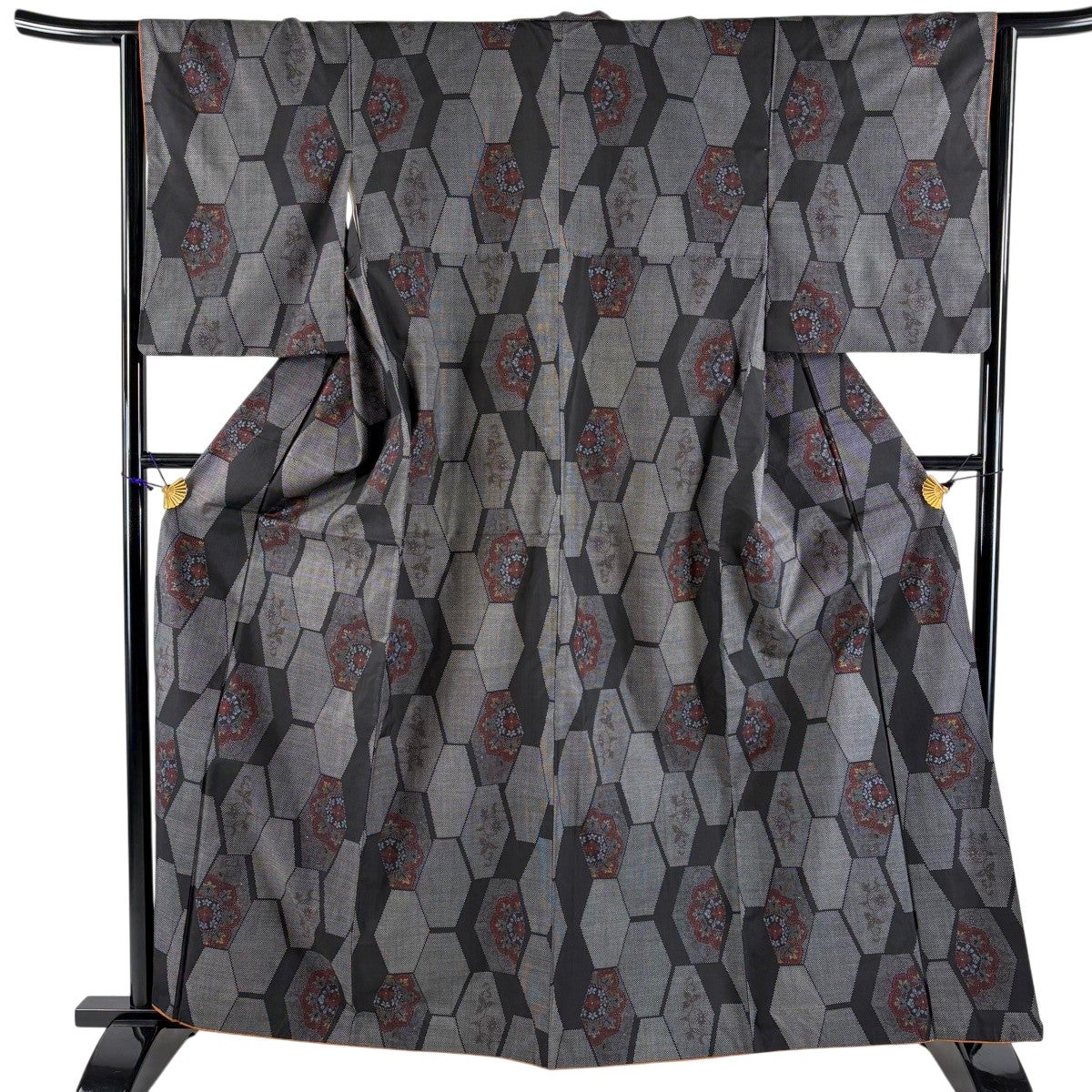 紬 身丈151.5cm 裄丈63.5cm S 袷 幾何学模様 墨色 正絹 秀品