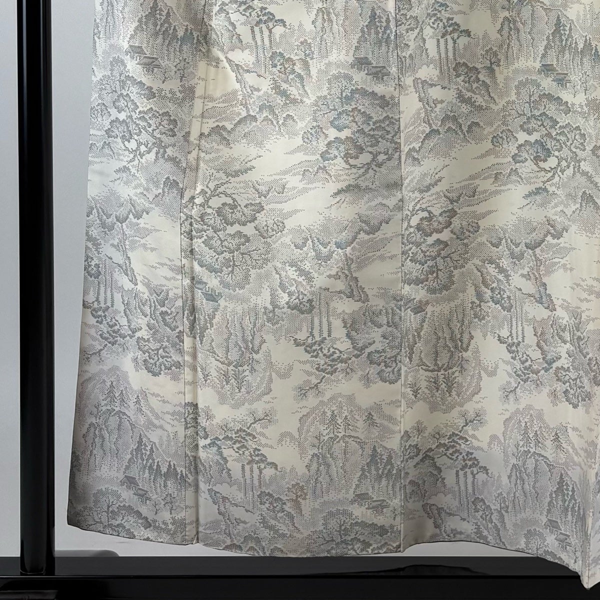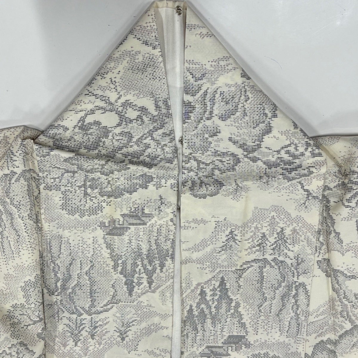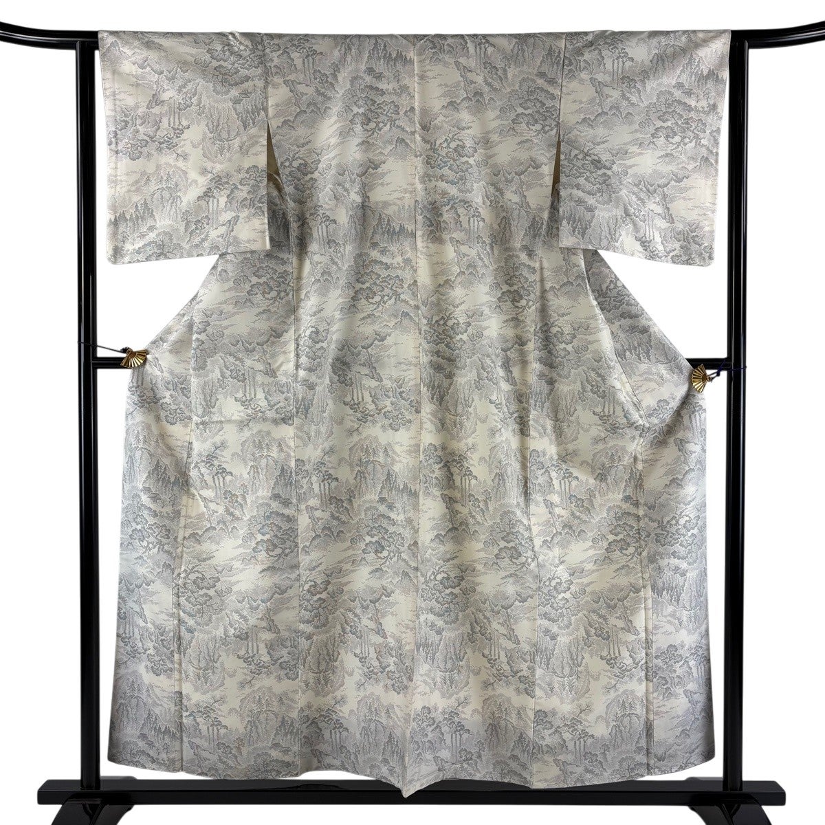 紬 身丈157cm 裄丈63cm S 袷 家屋 樹木 クリーム 正絹 秀品