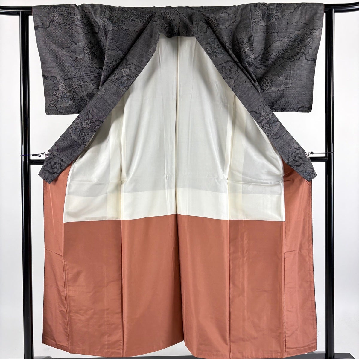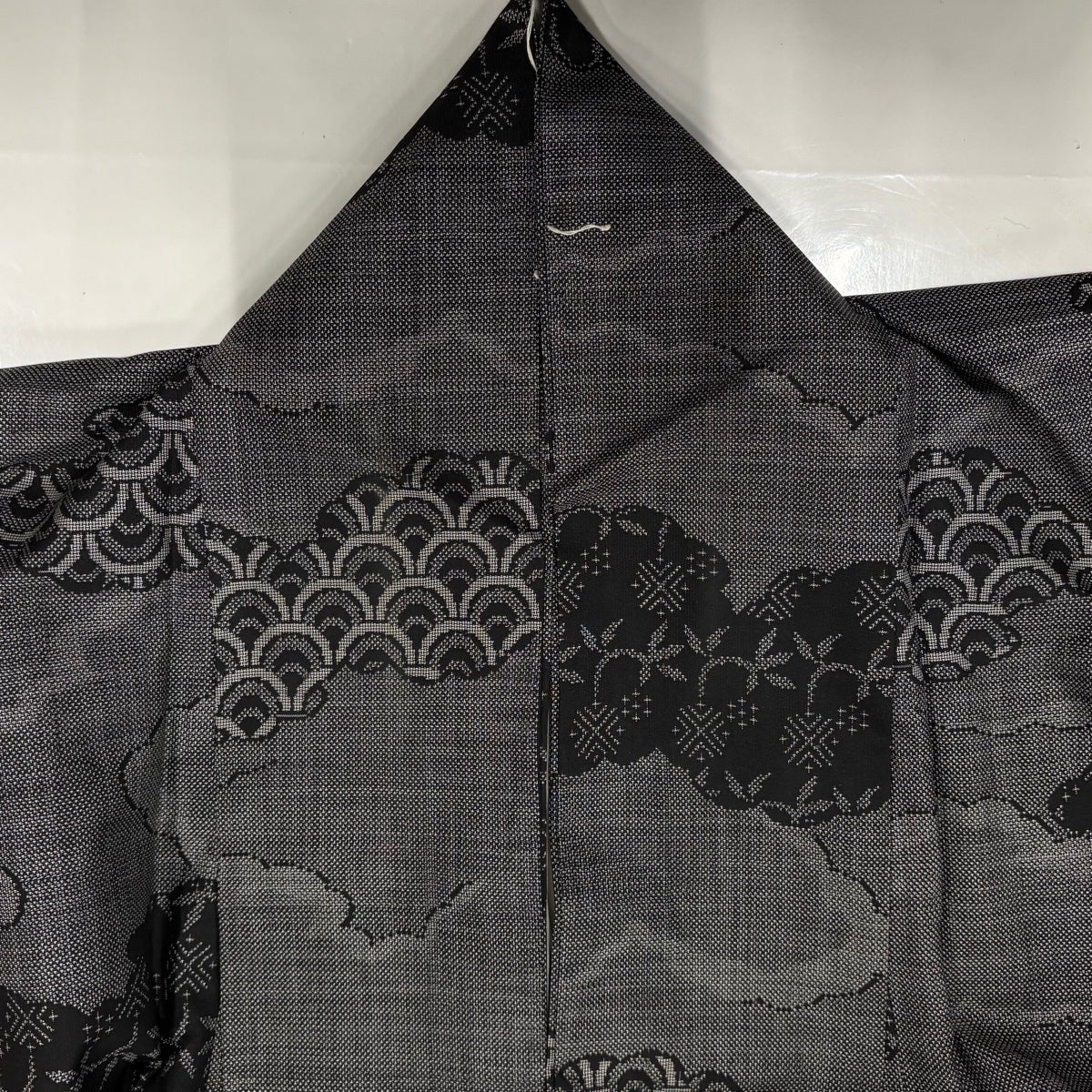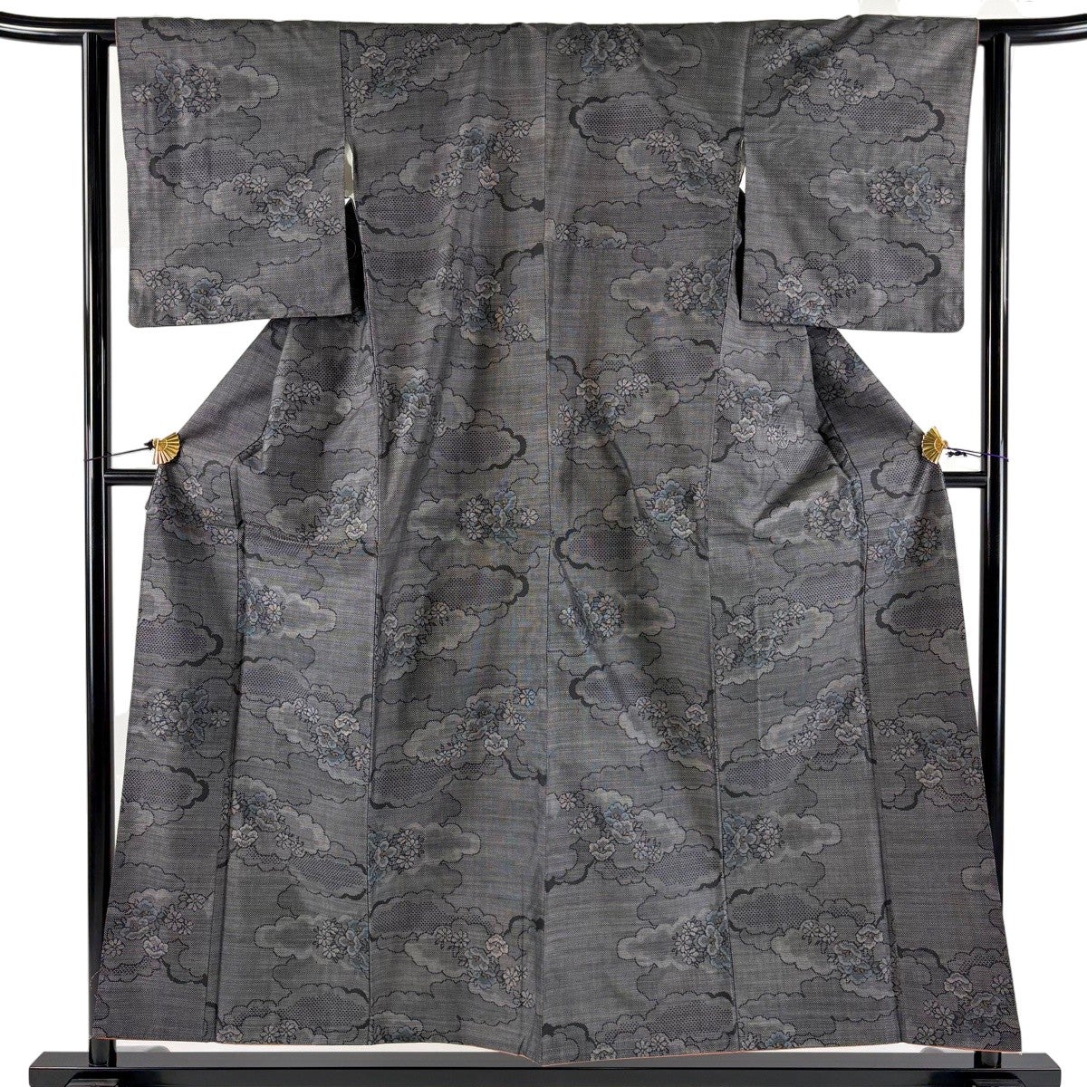 紬 身丈155.5cm 裄丈63cm S 袷 雲文 笹蔓 黒灰 正絹 秀品