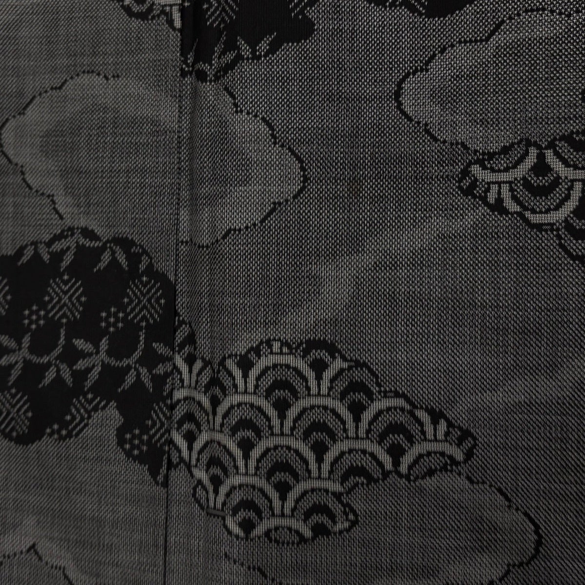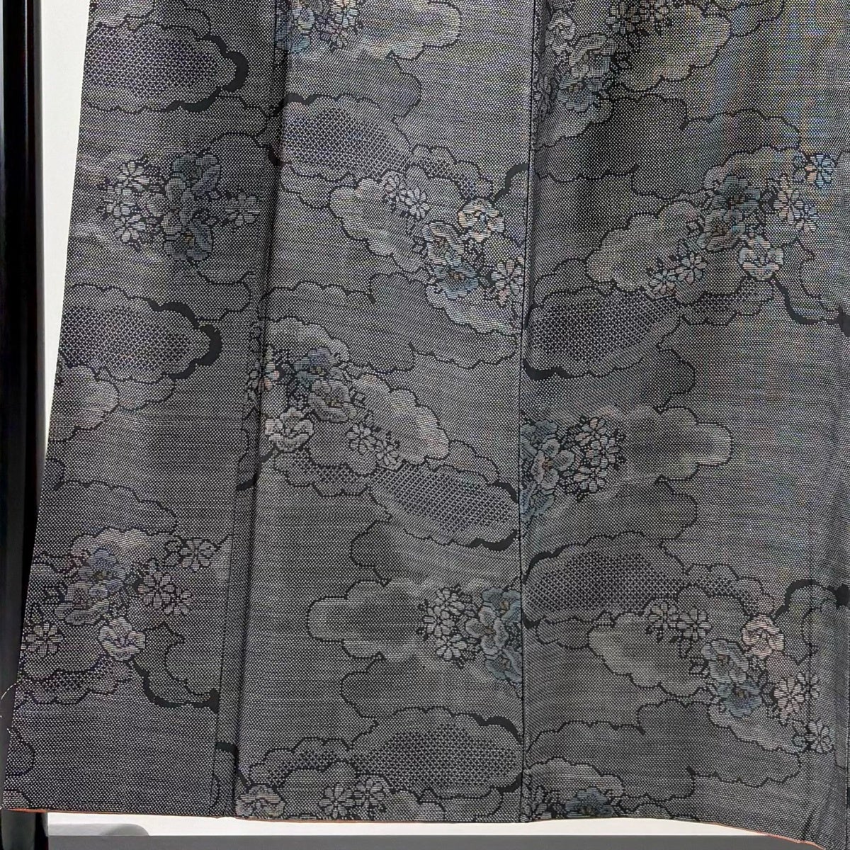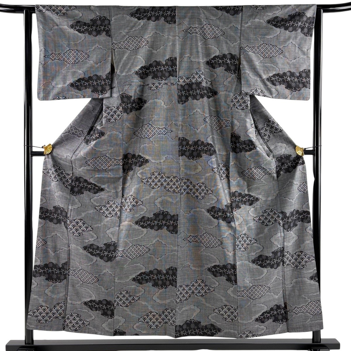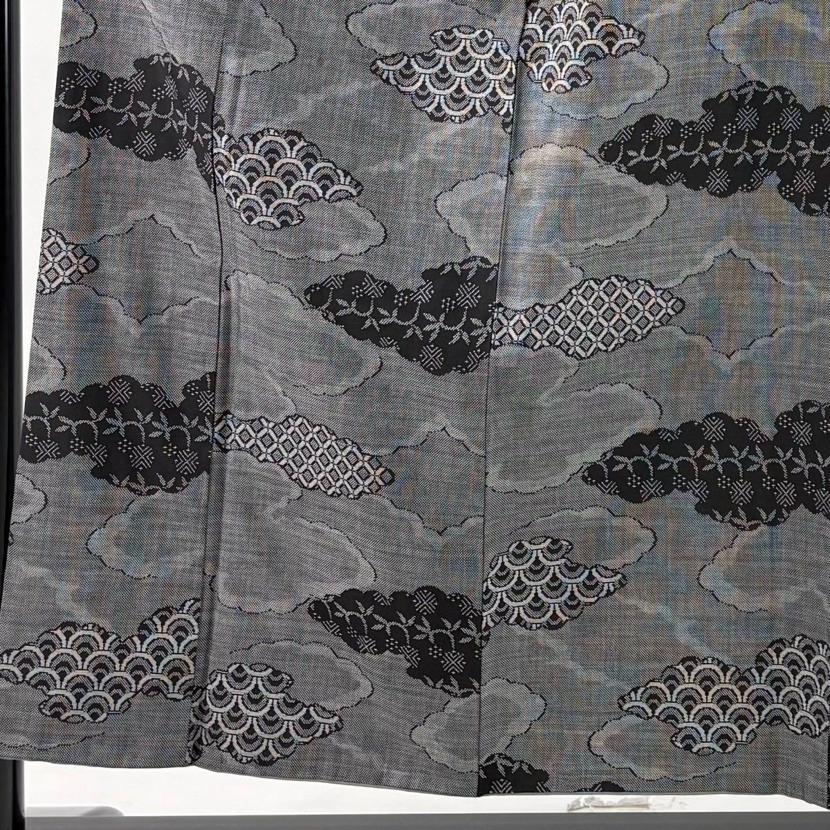 紬 身丈155.5cm 裄丈63cm S 袷 雲文 笹蔓 黒灰 正絹 秀品