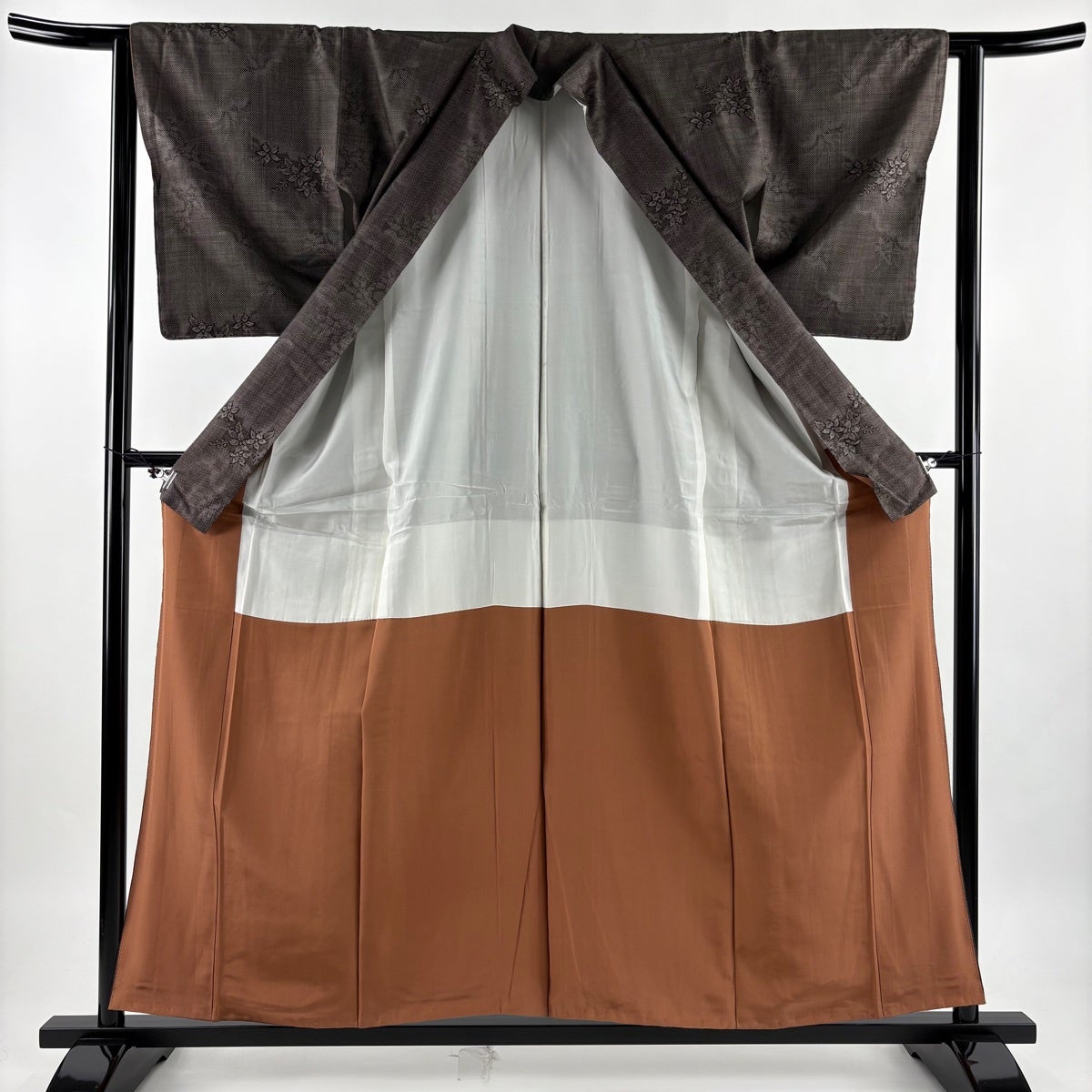紬 身丈158cm 裄丈62.5cm S 袷 草花 雲文 茶色 正絹 秀品