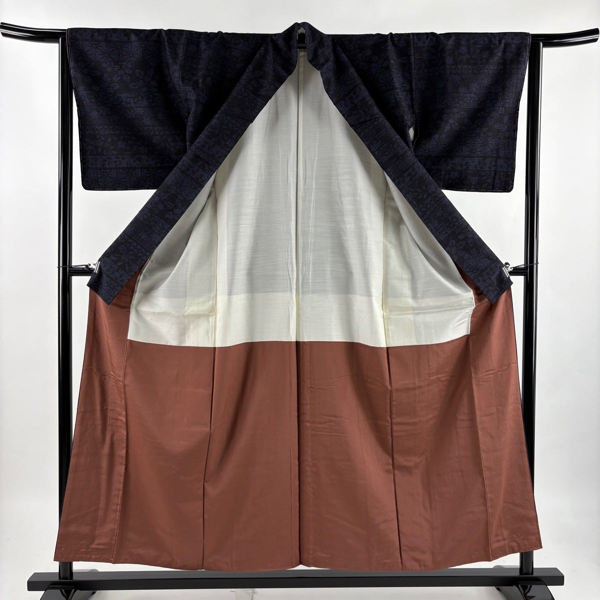 紬 身丈158.5cm 裄丈64.5cm M 袷 幾何学模様 紺色 正絹 秀品