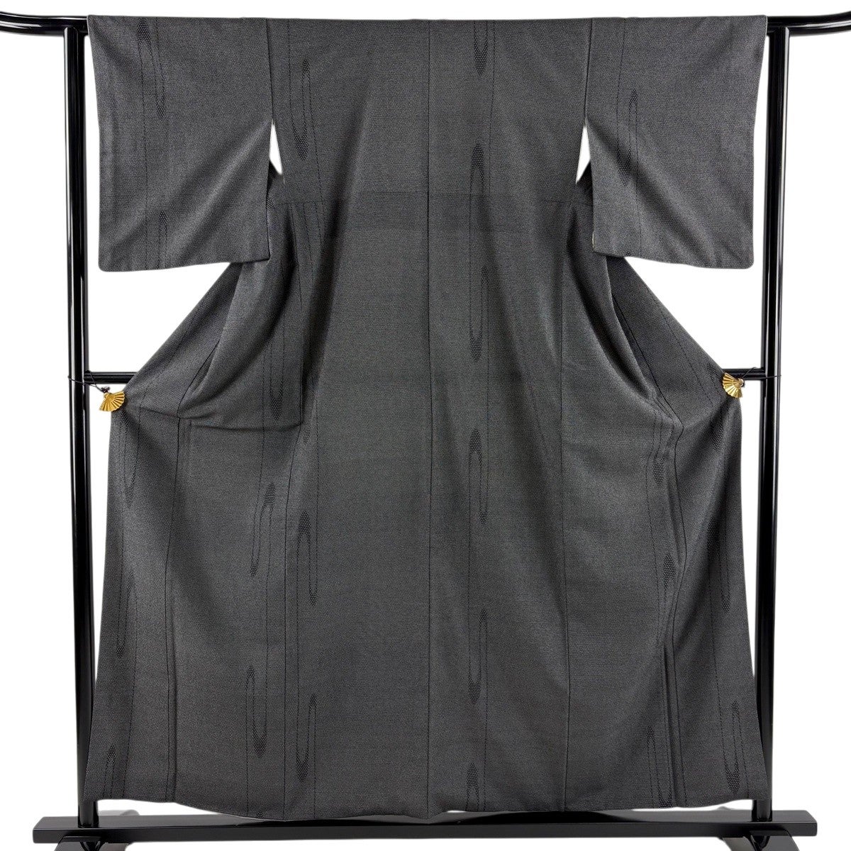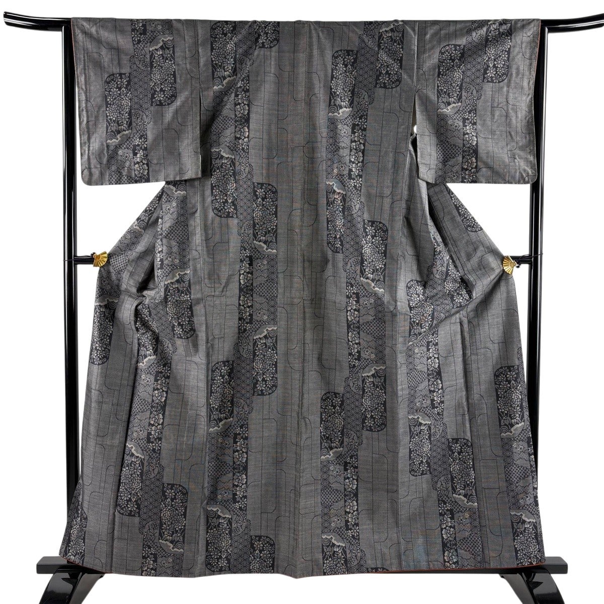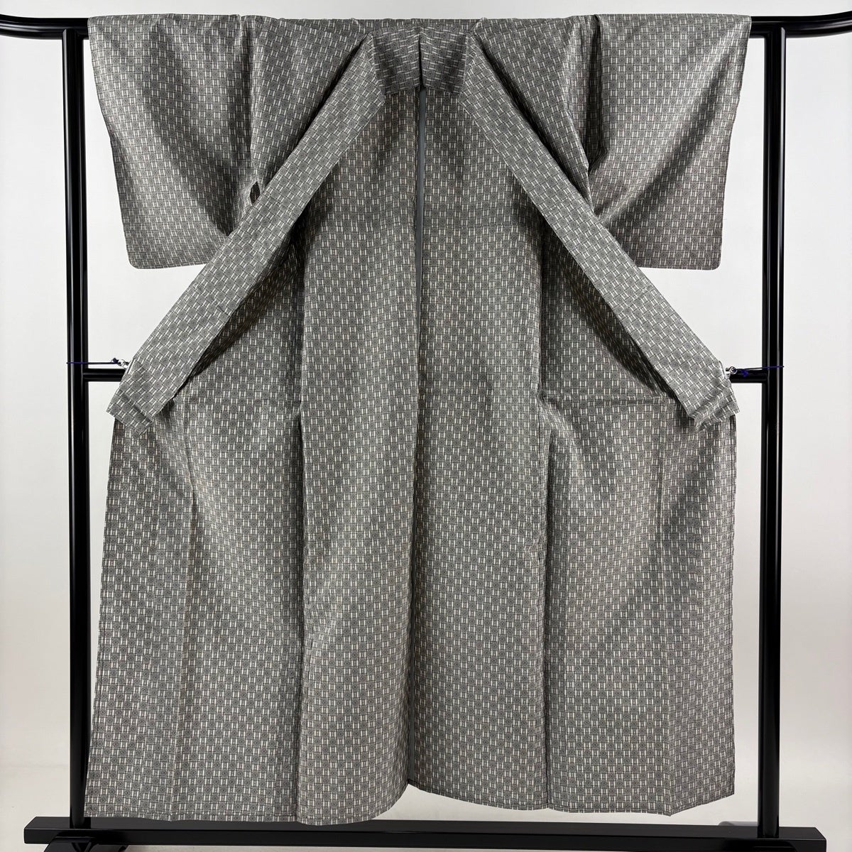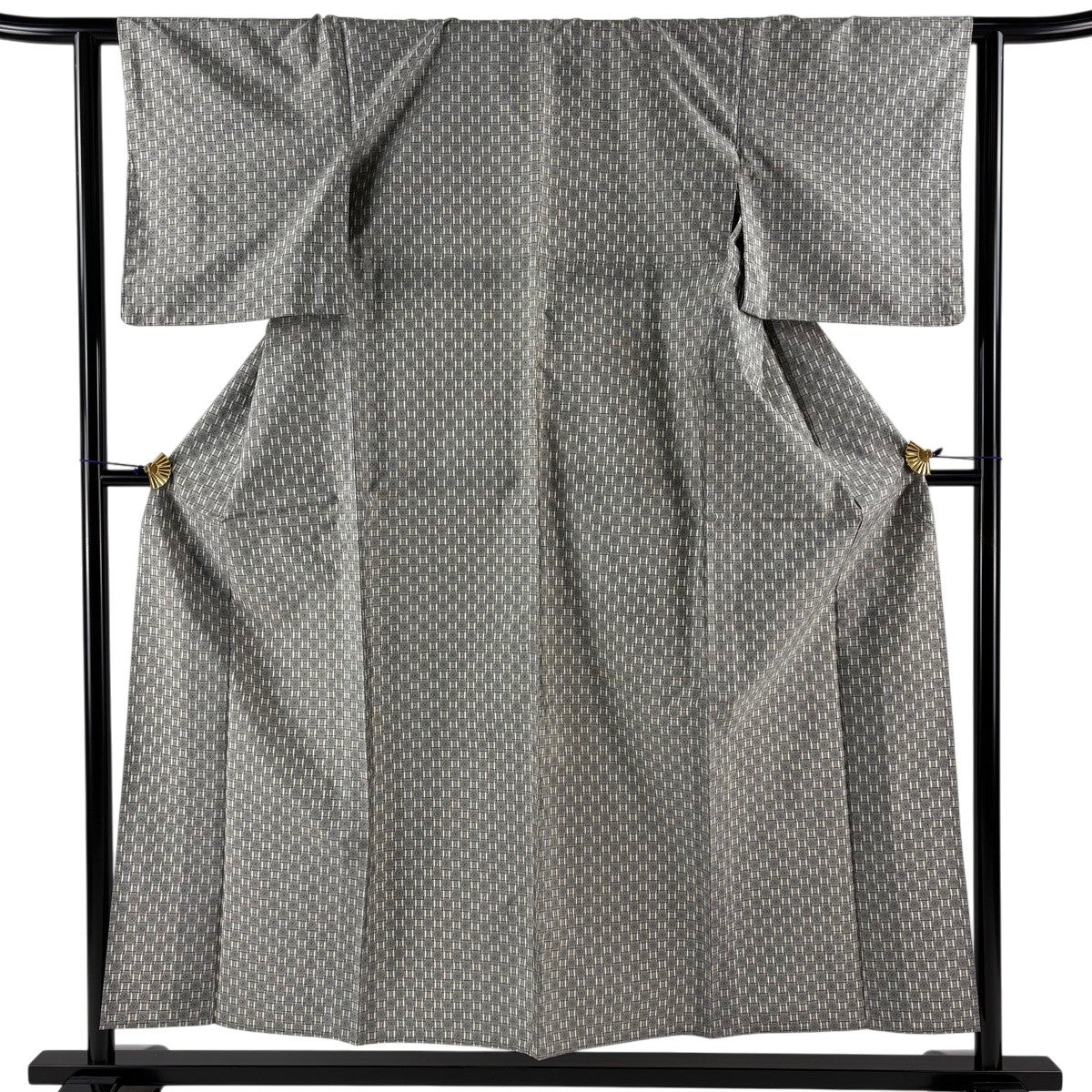 【美品】 紬 身丈156cm 裄丈62cm S 単衣 幾何学 灰色 正絹 秀品
