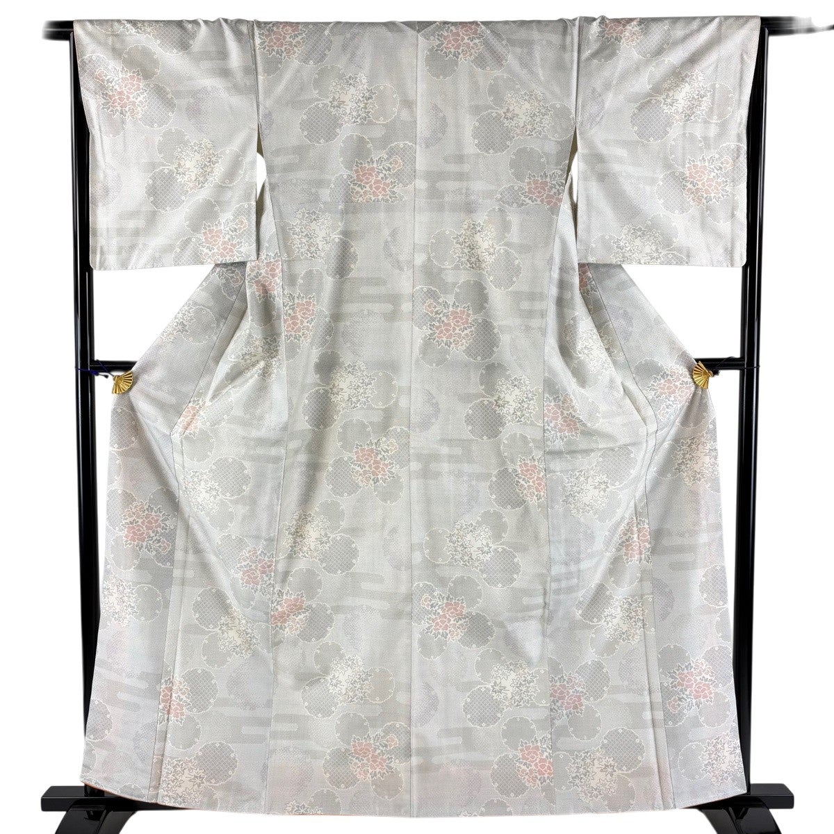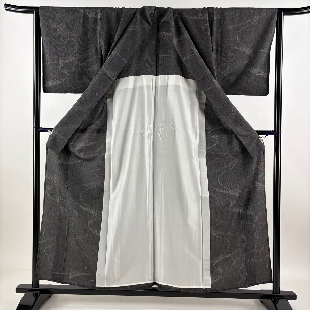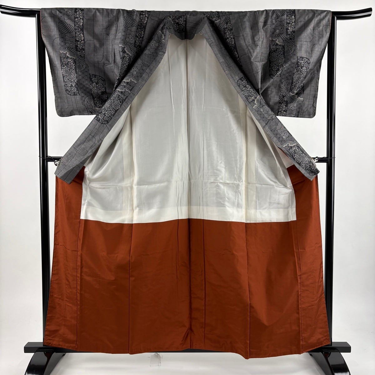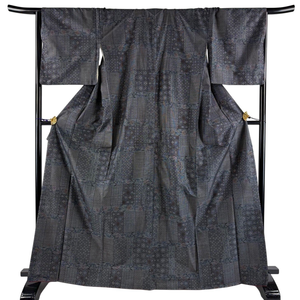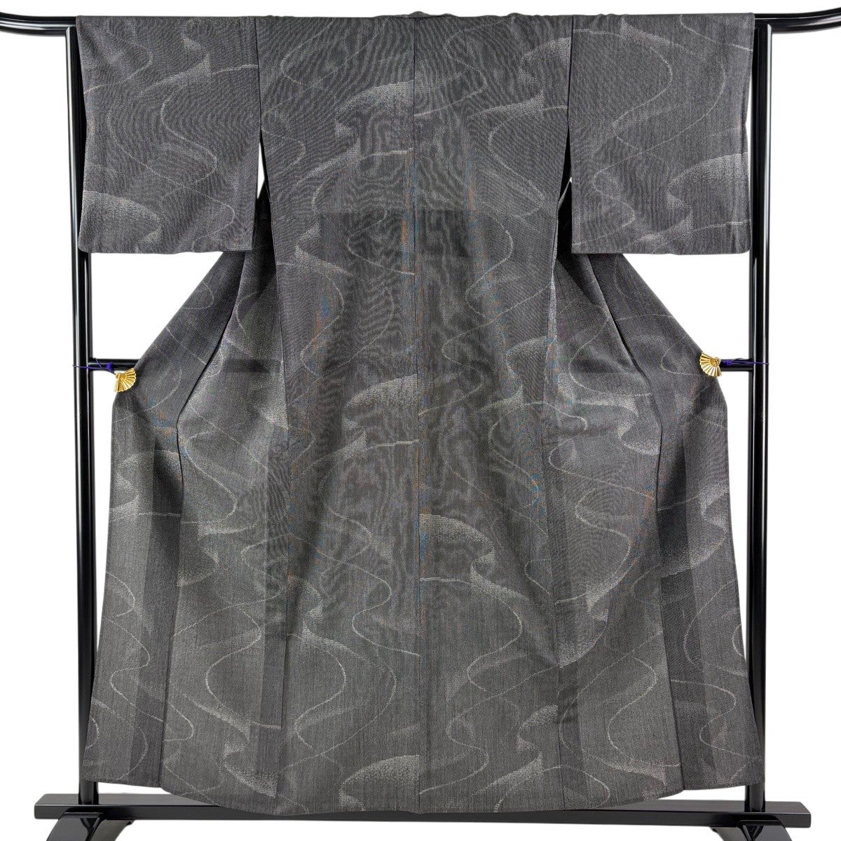 【美品】 紬 身丈156cm 裄丈62cm S 単衣 幾何学 灰色 正絹 秀品