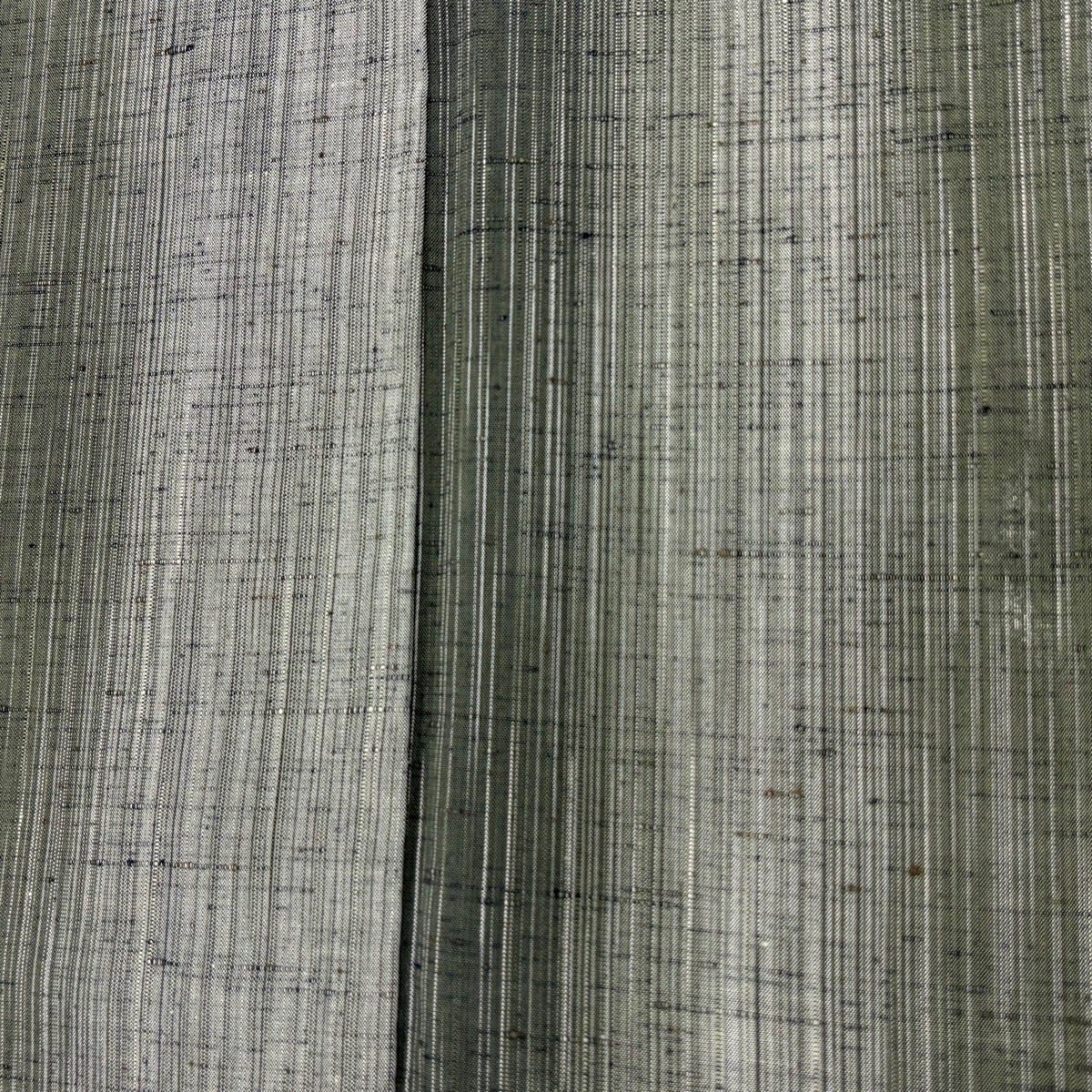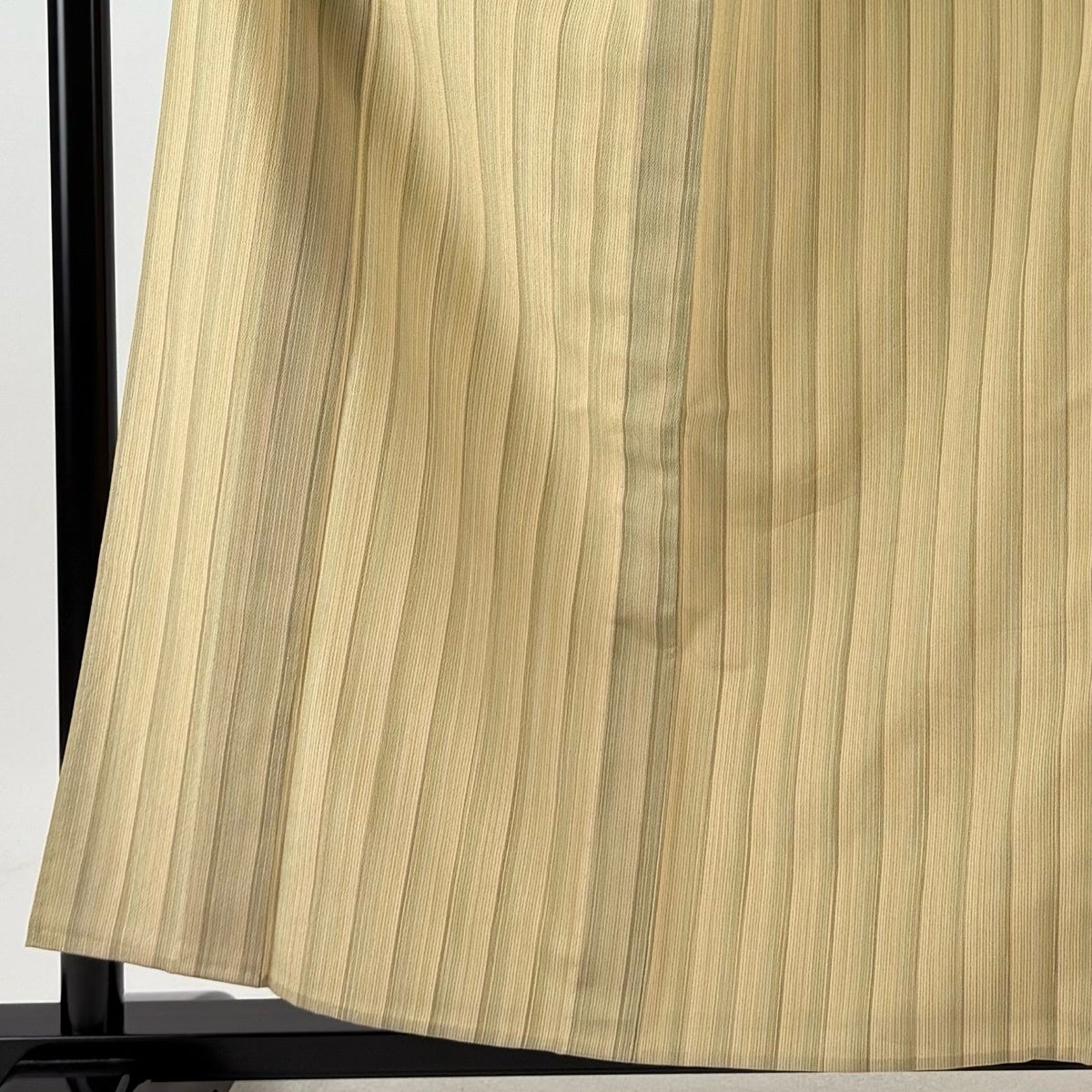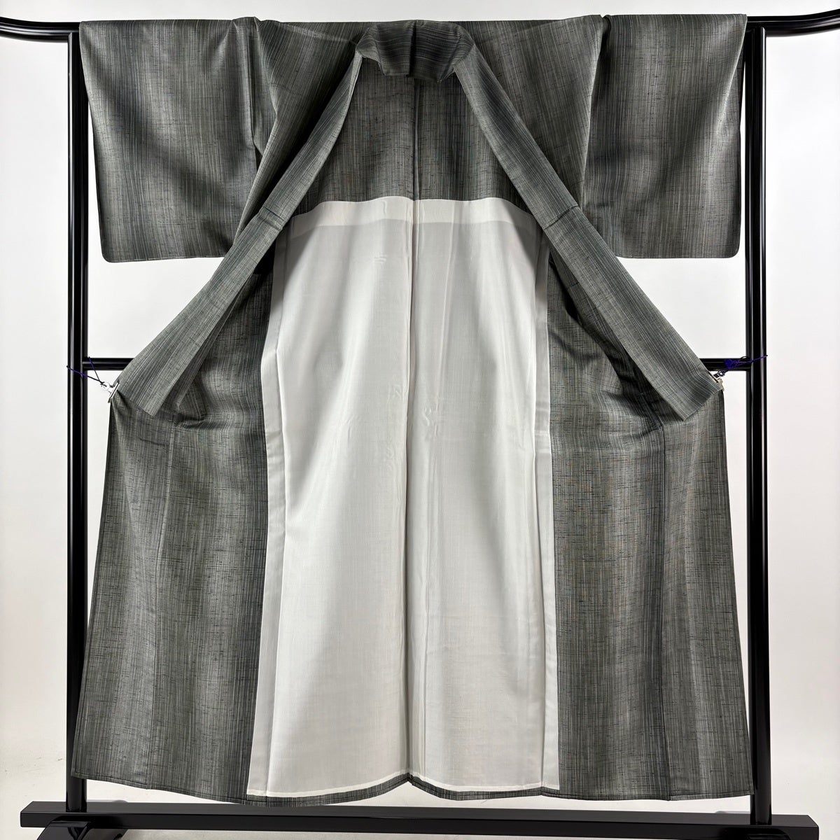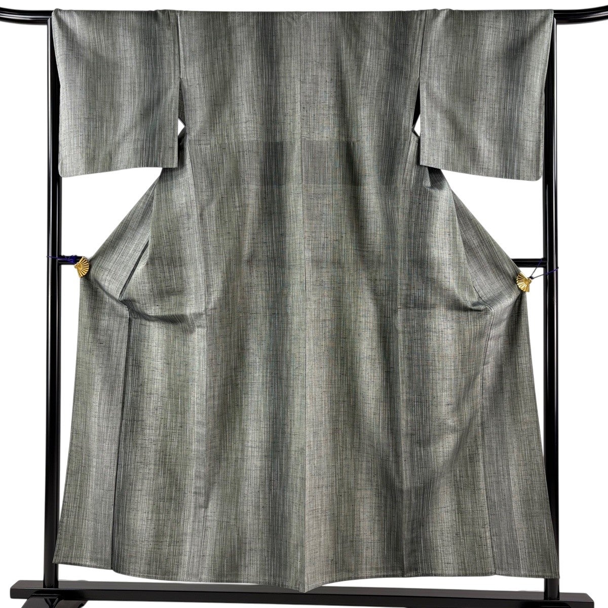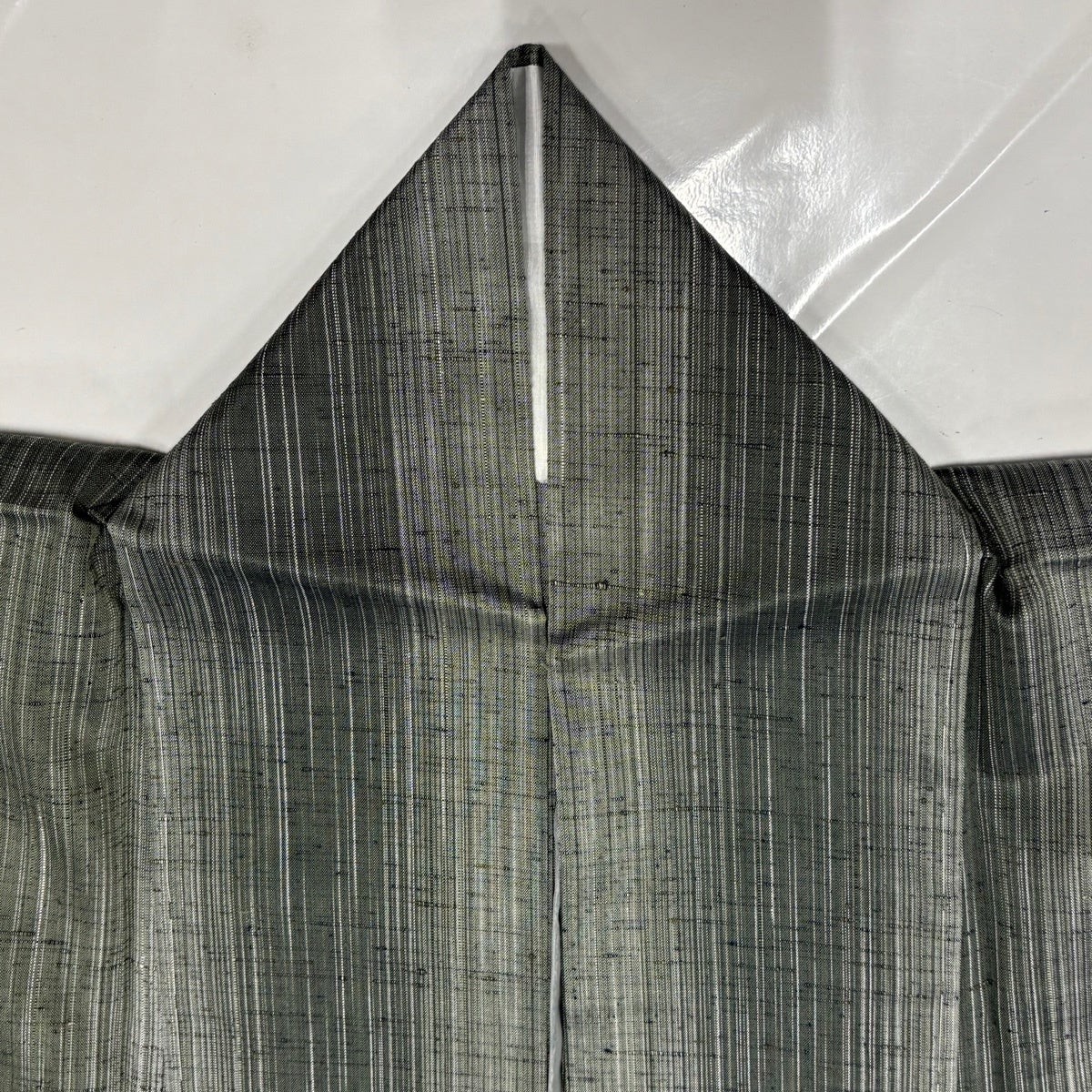 【美品】 紬 身丈156cm 裄丈66.5cm M 単衣 縞 灰緑 正絹 名品