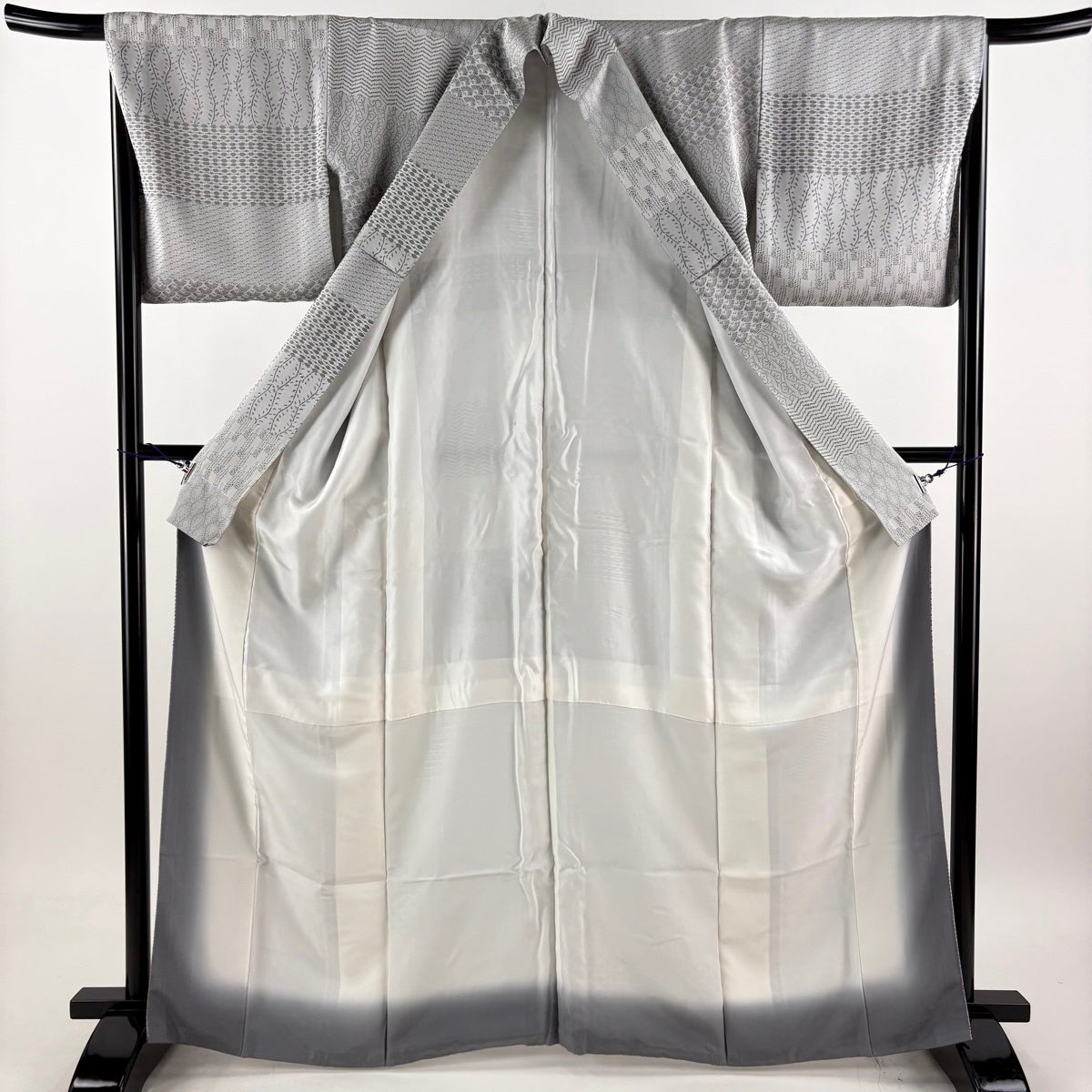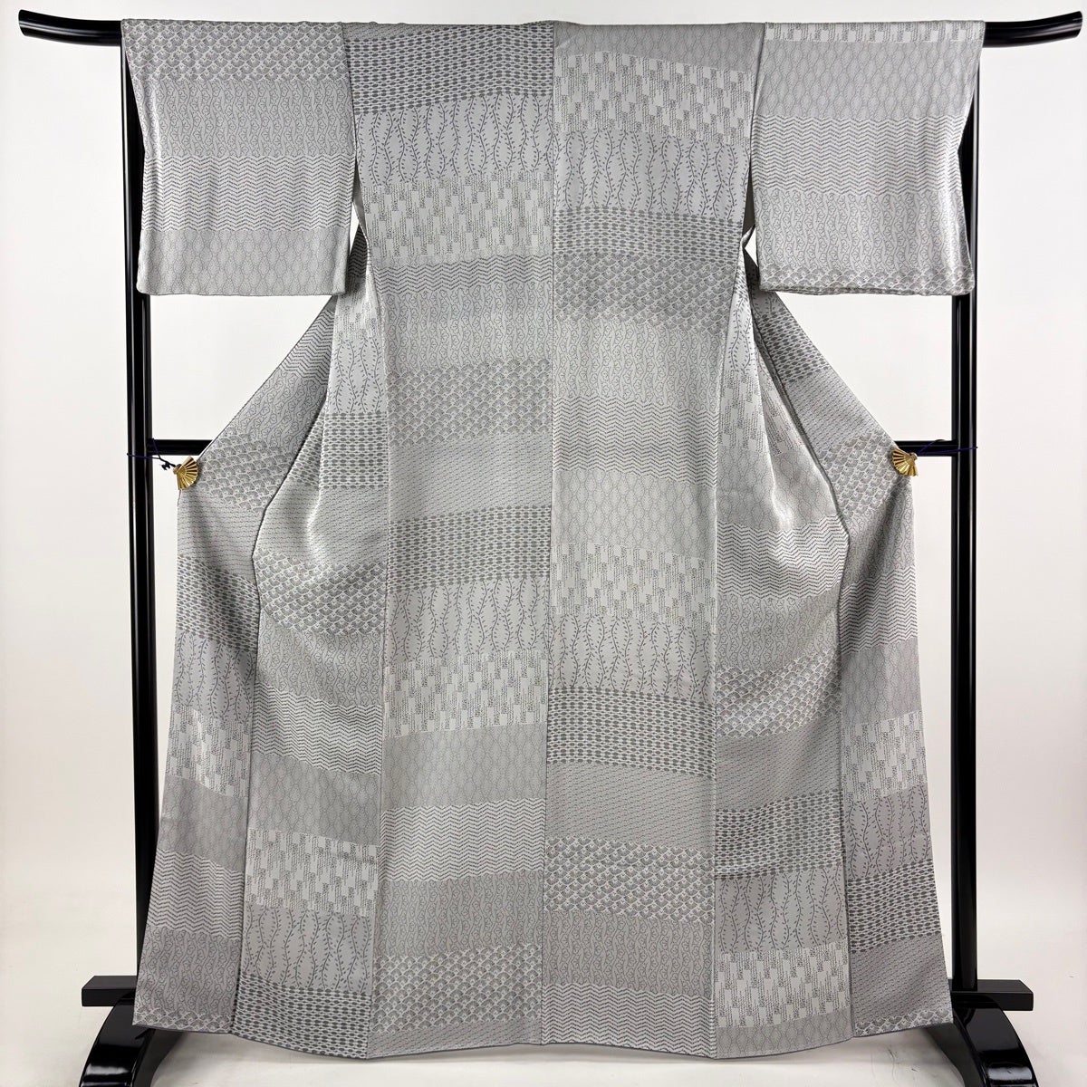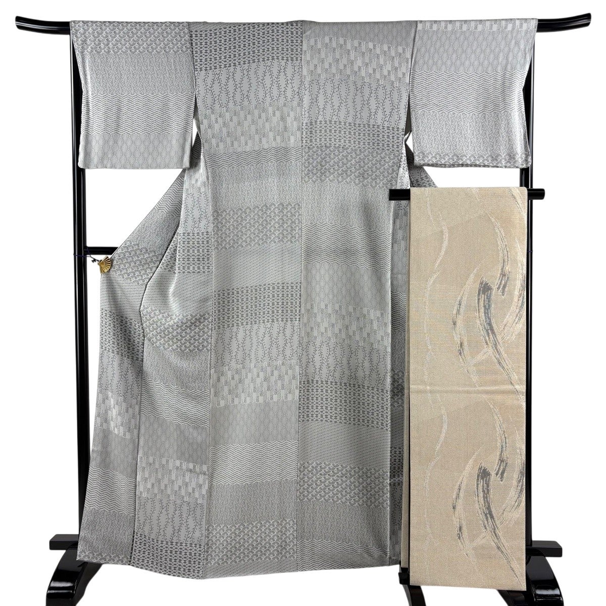 【美品】 お召 身丈164.5cm 裄丈66cm M 袷 袋帯セット 立涌 幾何学 灰色 正絹 秀品