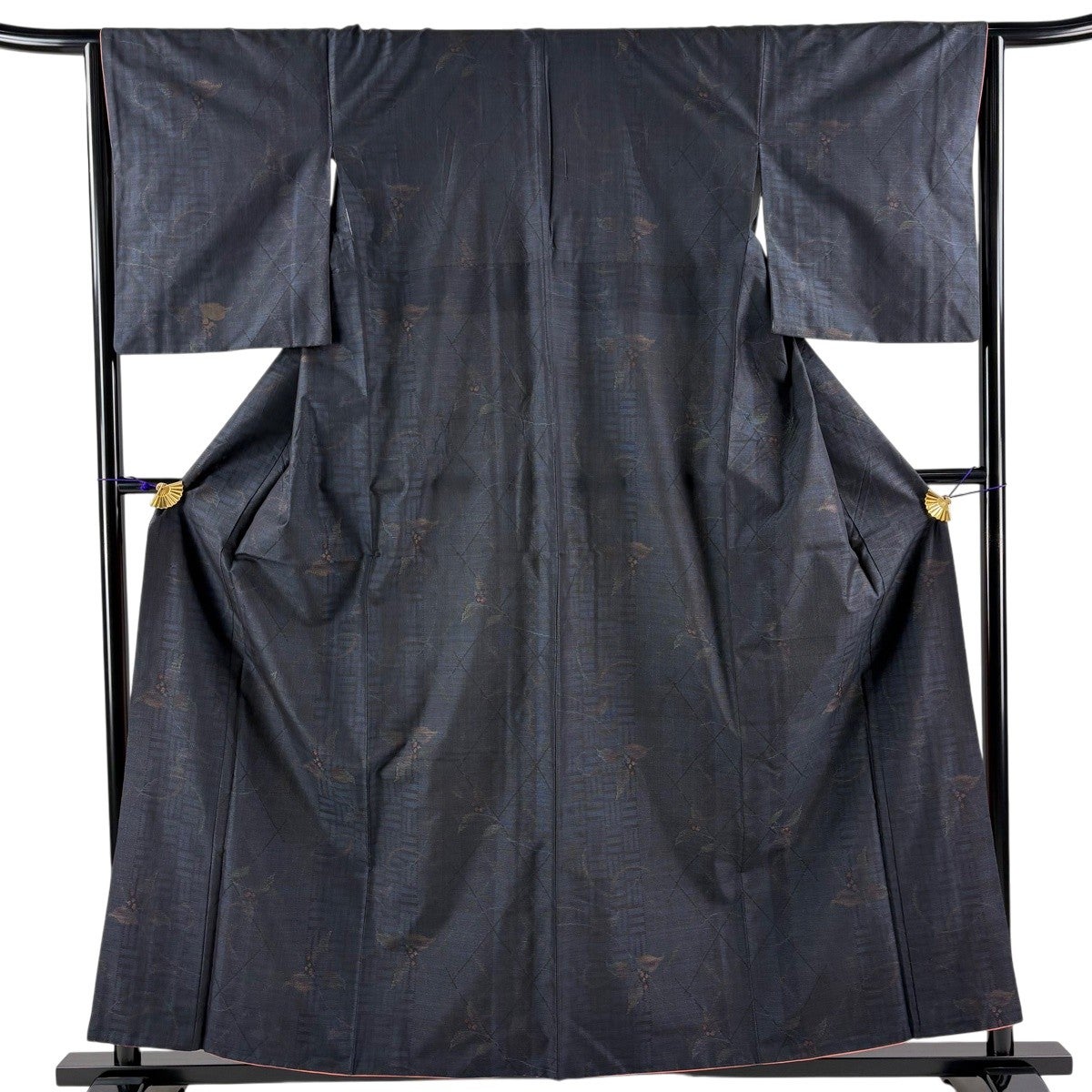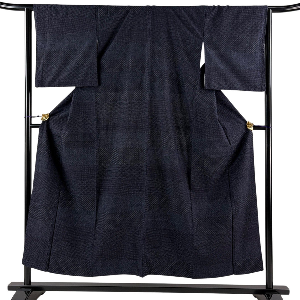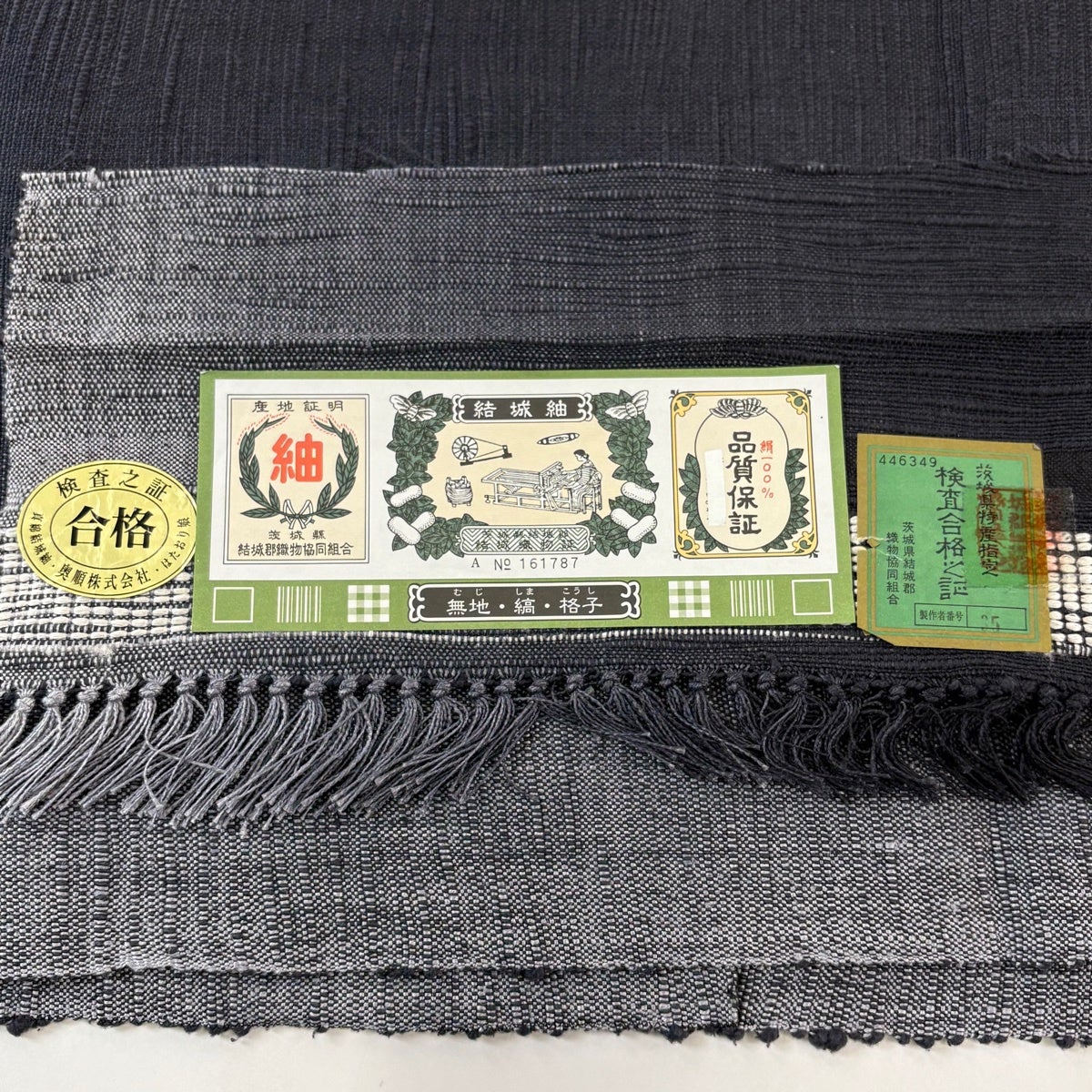 【美品】 結城紬 身丈152cm 裄丈64cm M 袷 本場結城紬 宮崎株式会社 証紙あり 段縞 斜め格子 濃紺 正絹 逸品