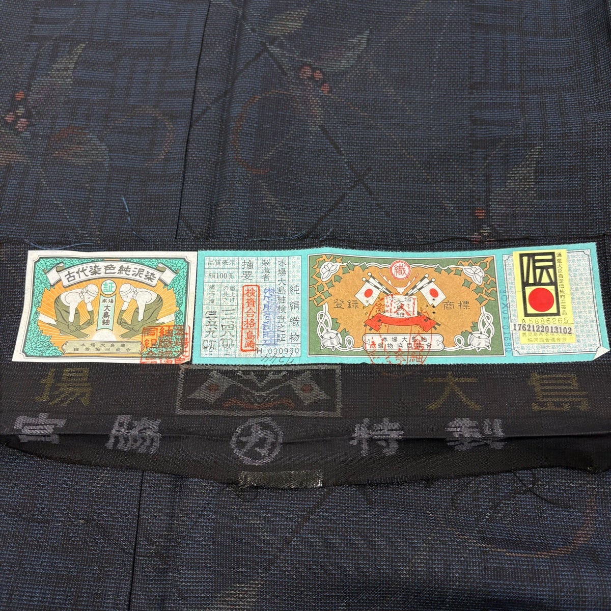 大島紬 身丈157cm 裄丈64.5cm M 袷 やまと 証紙あり 葉と実 濃紺 正絹 秀品