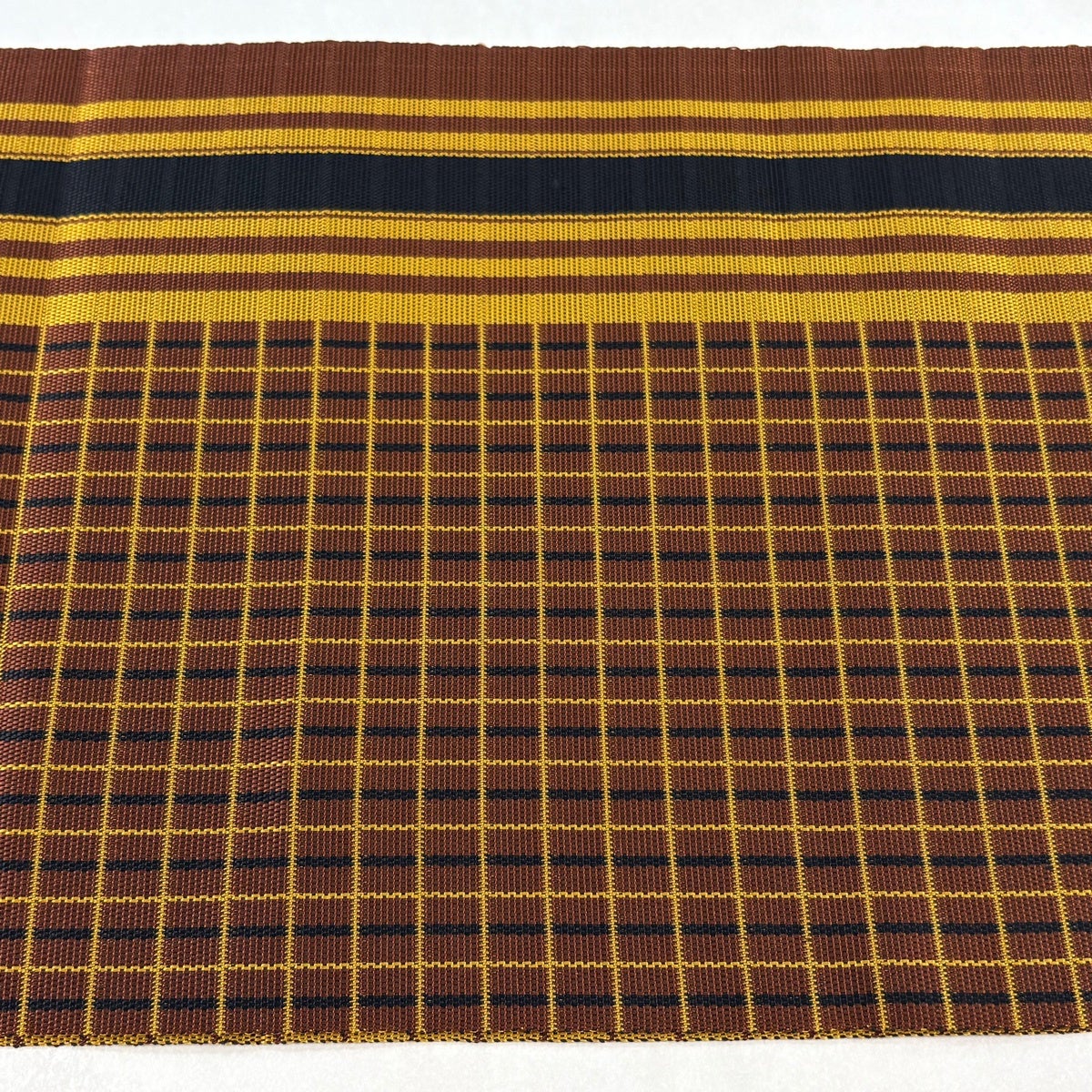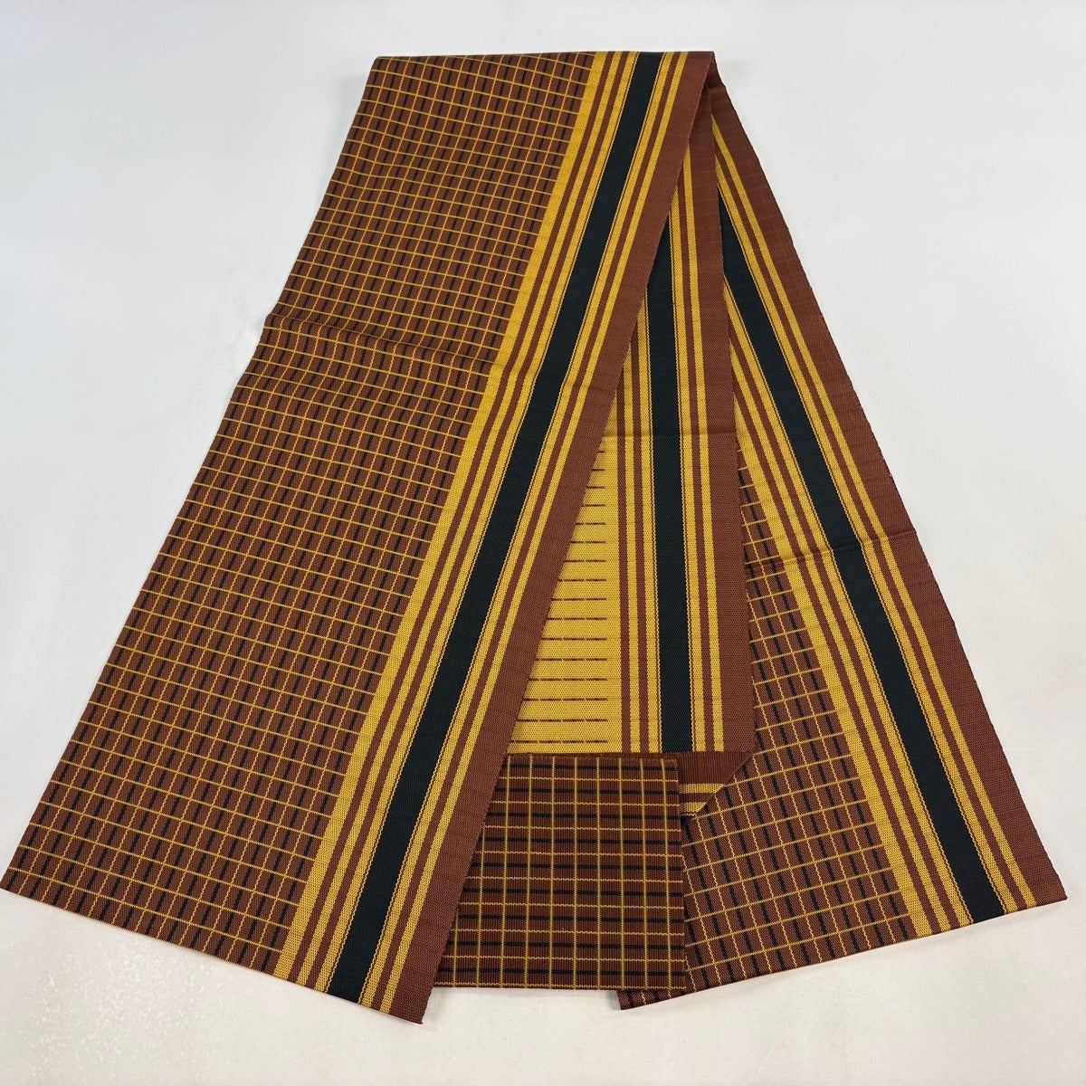 【美品】 名古屋帯 逸品 八寸名古屋帯 松葉仕立て 格子 縞模様 焦茶色 正絹