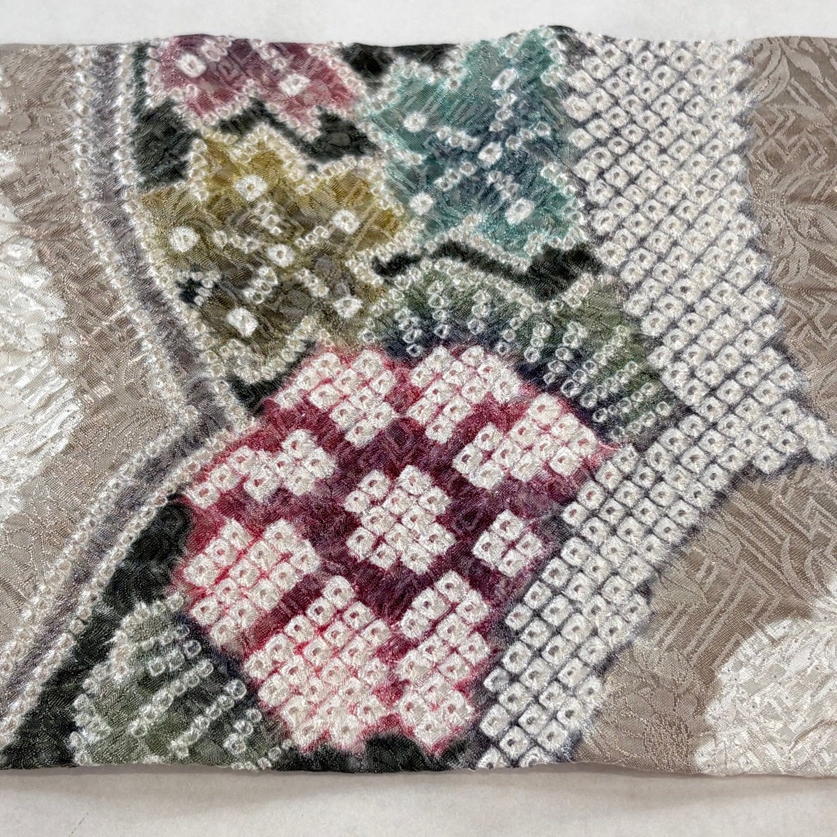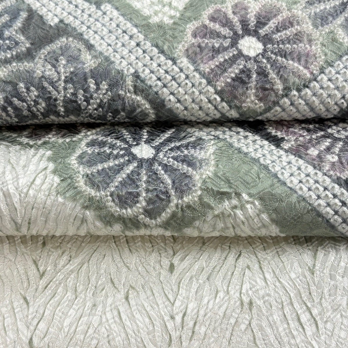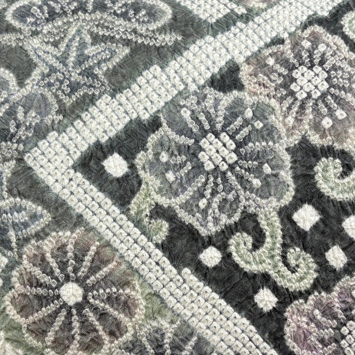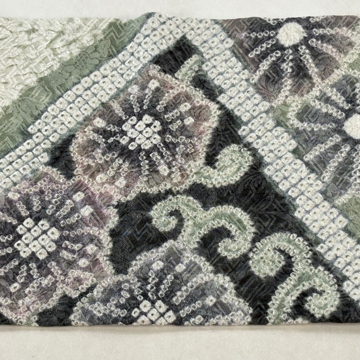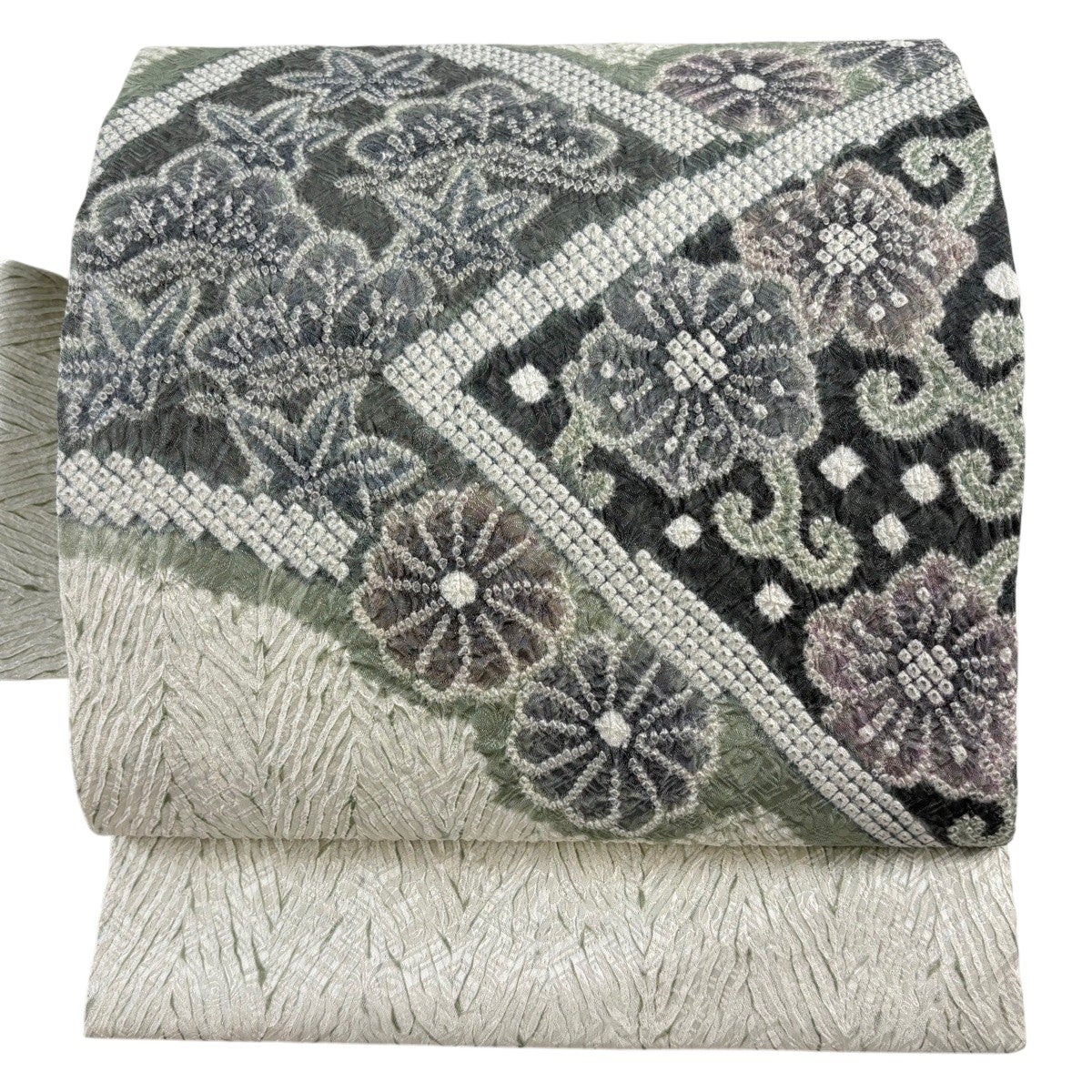 【美品】 名古屋帯 逸品 花唐草 笠松 絞り 灰緑 正絹