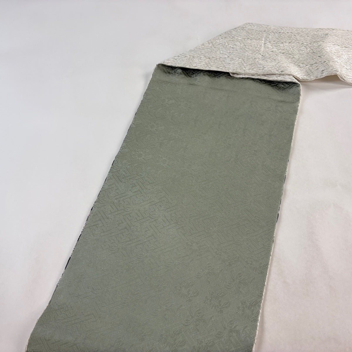 半幅帯 優品 宝尽くし 松竹梅 薄緑 化繊