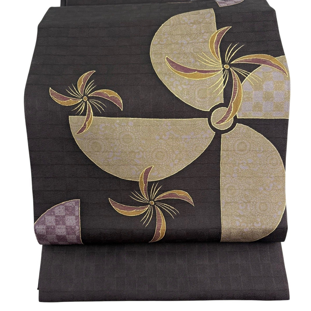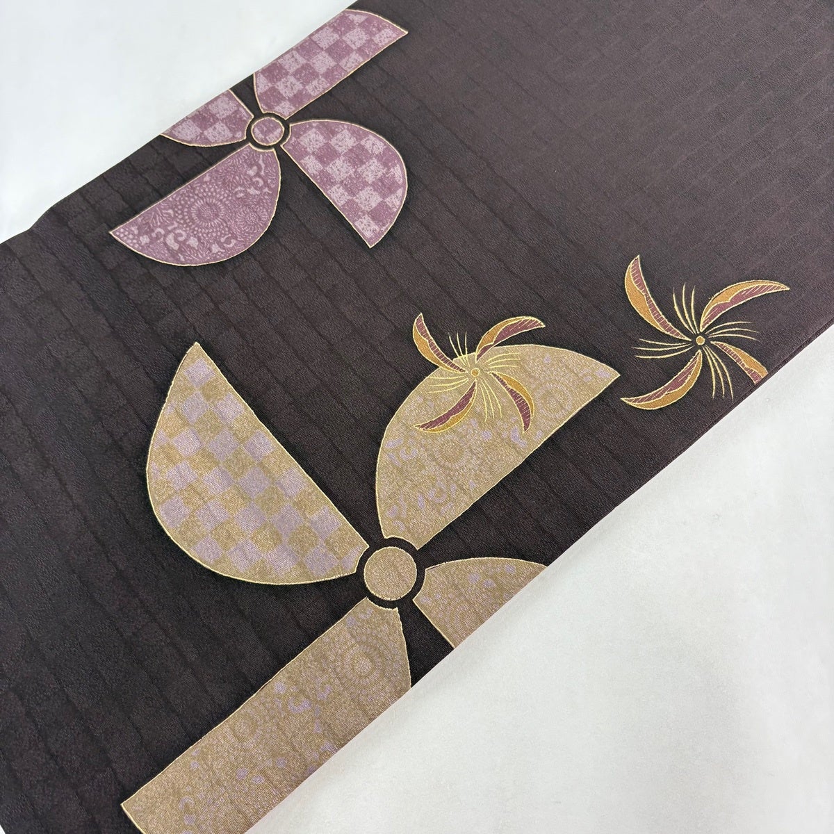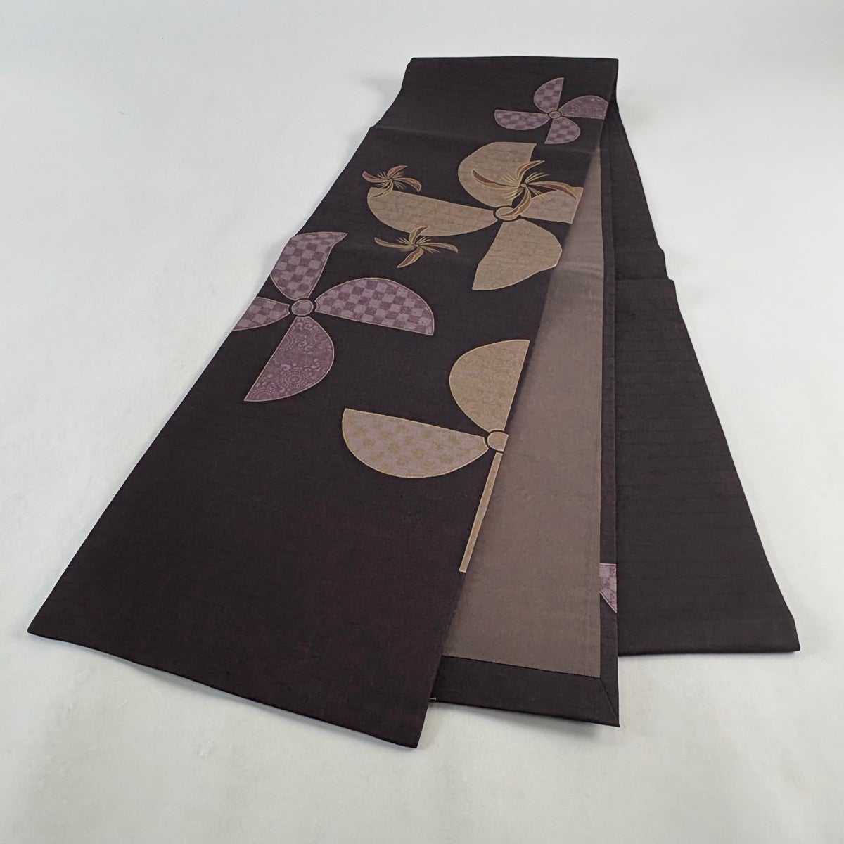 【美品】半幅帯 優品 七宝繋ぎ 花 濃紫 化繊