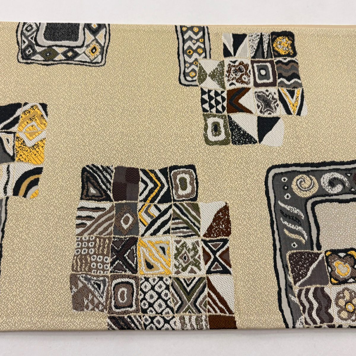 【美品】 名古屋帯 名品 格子 幾何学模様 焦茶色 正絹