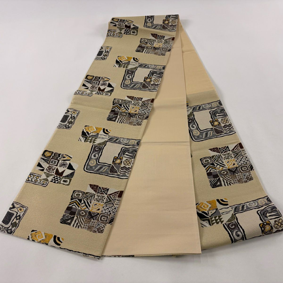 【美品】 袋帯 名品 リバーシブル よろけ縞 薄黄土色 全通 正絹