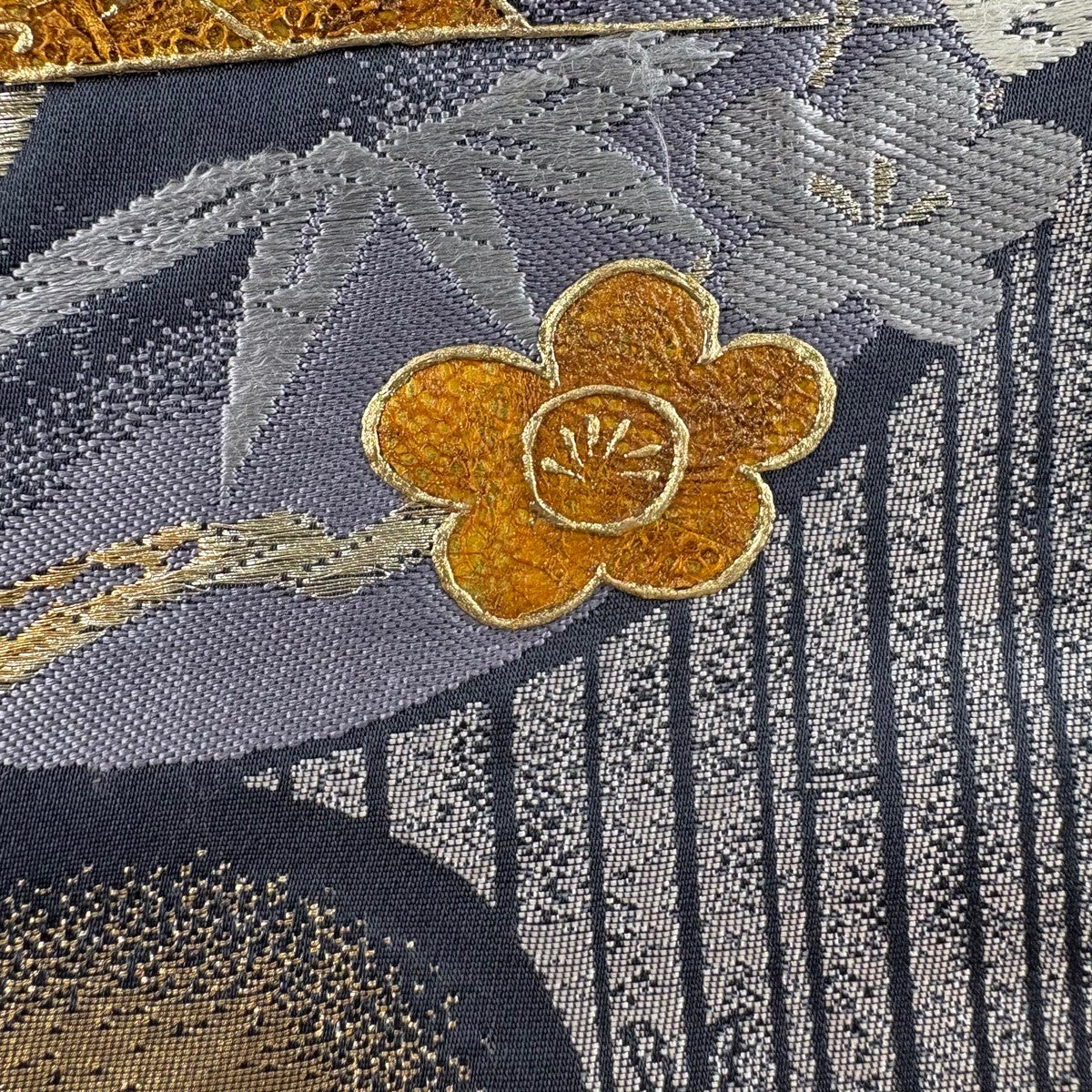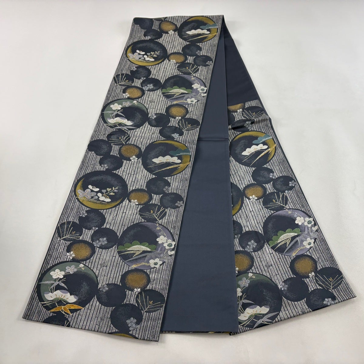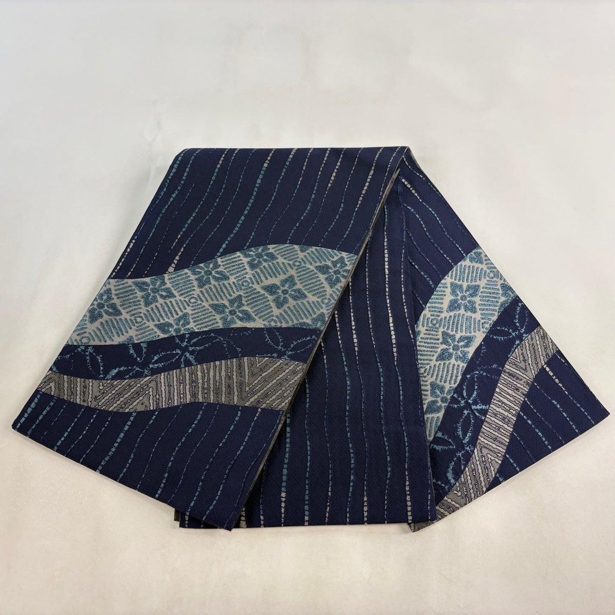 【美品】 袋帯 秀品 証紙あり 草花 縞 紺色 六通 正絹