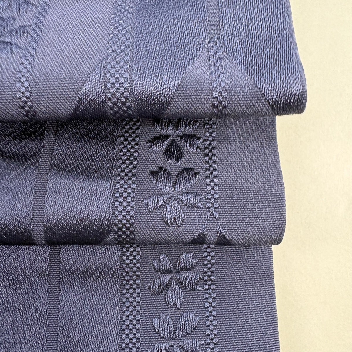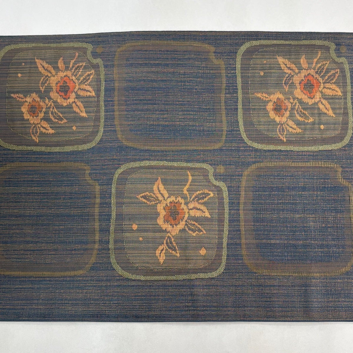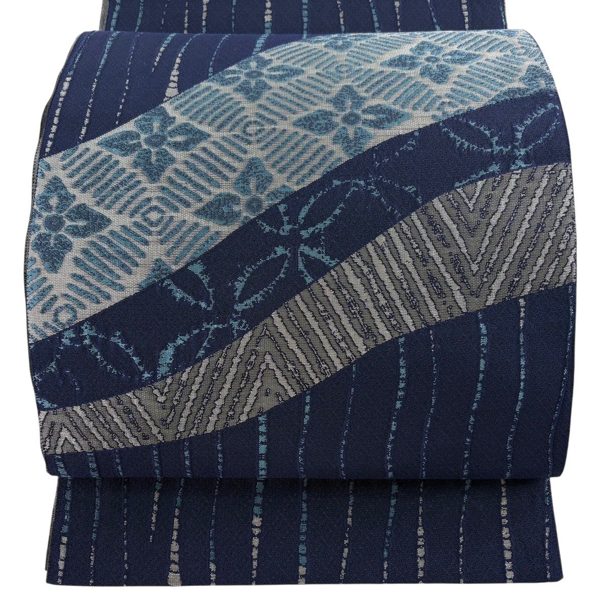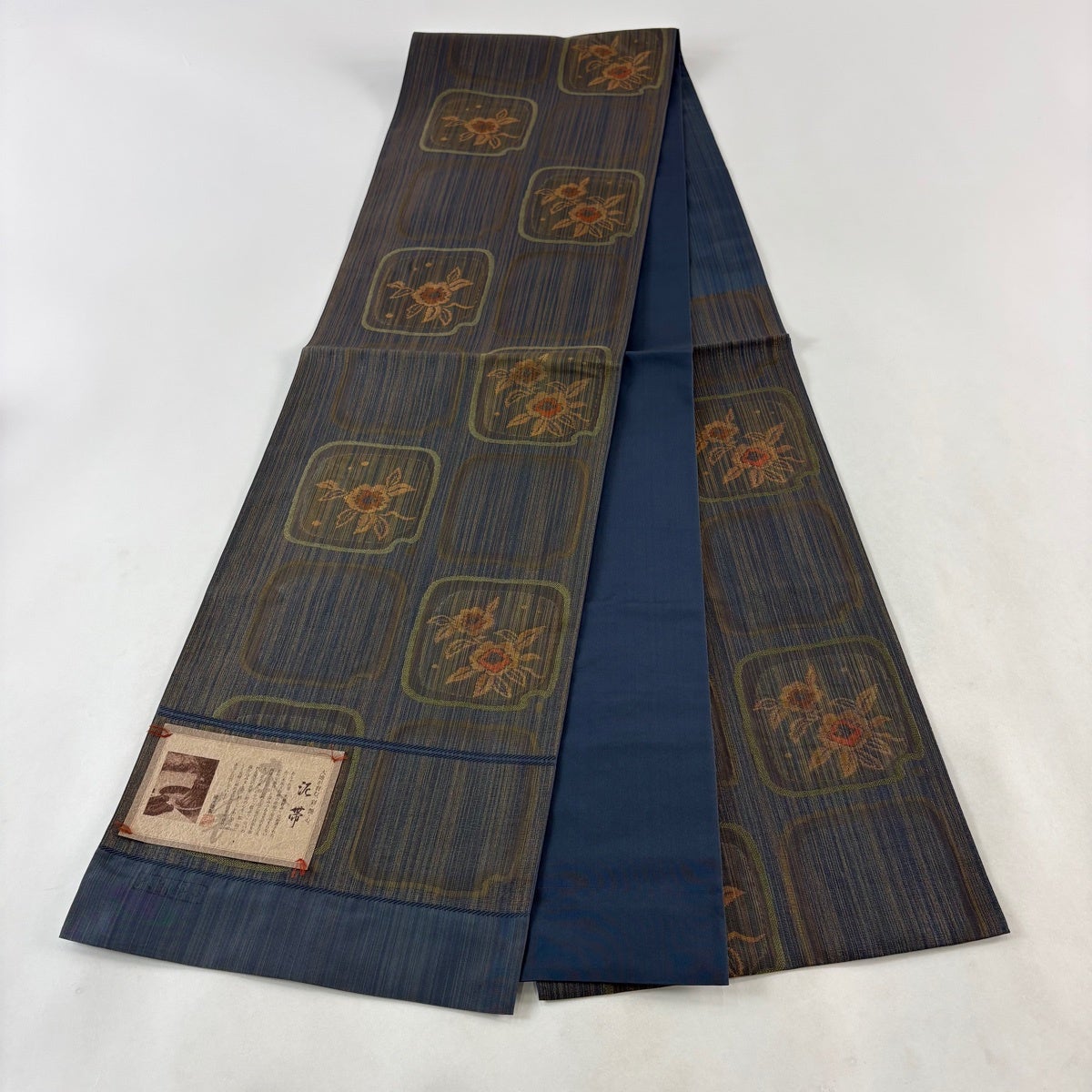 【美品】 袋帯 秀品 証紙あり 草花 縞 紺色 六通 正絹