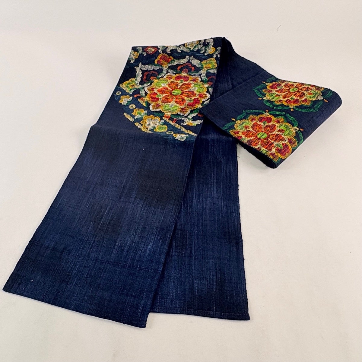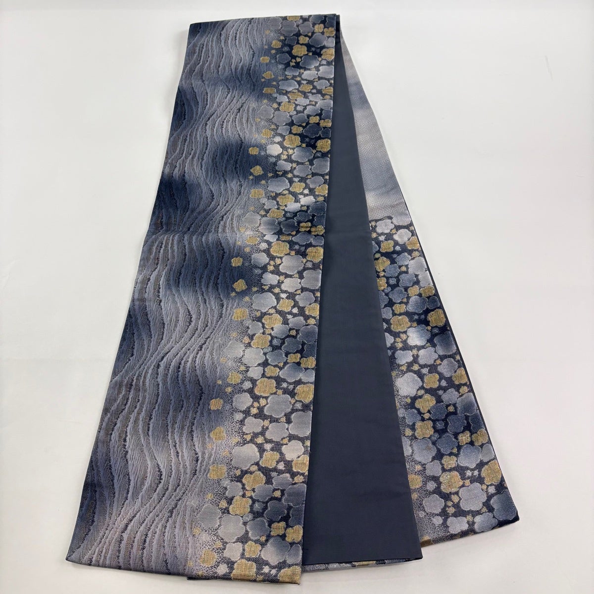 50%OFF 袋帯 秀品 振袖向き 花 笹 金糸 箔 紺色 六通 正絹 K50