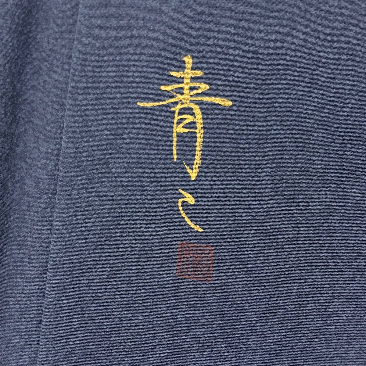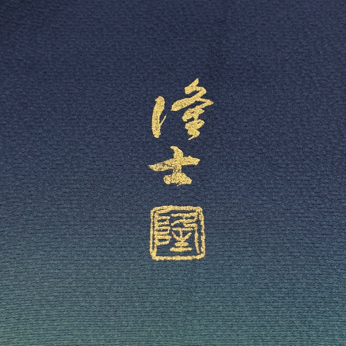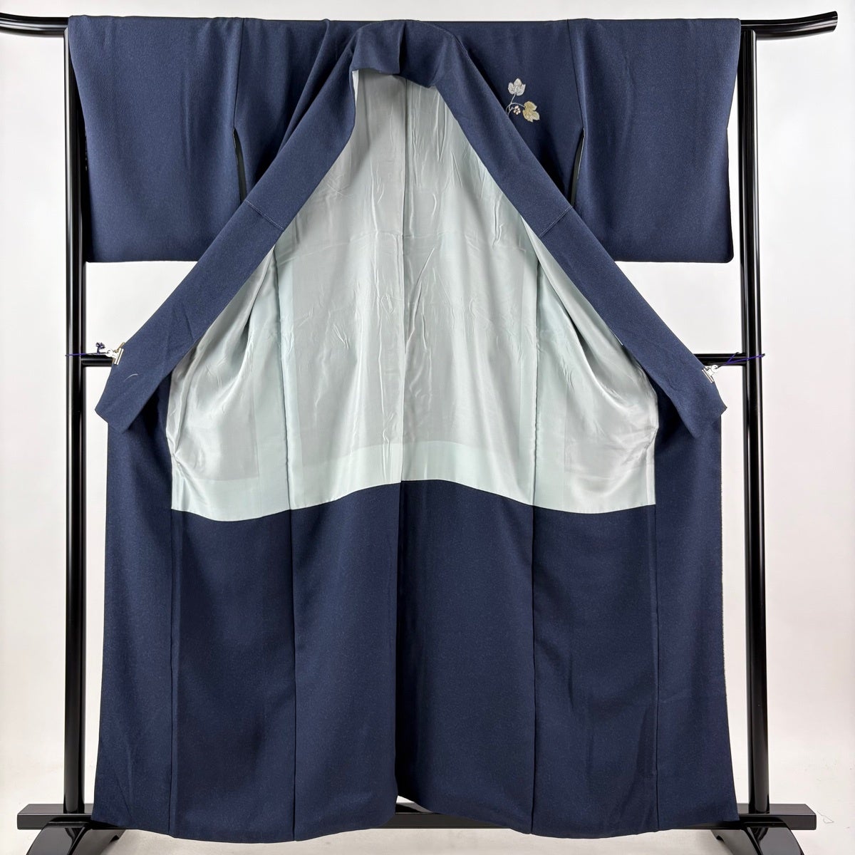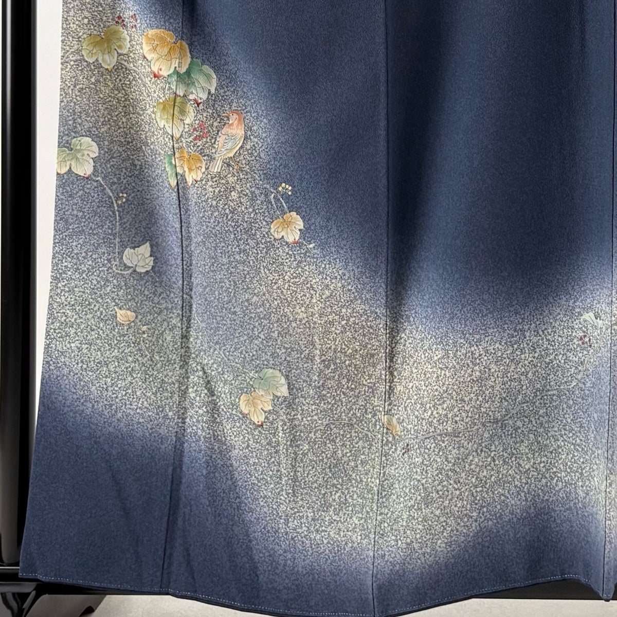 付下げ 身丈160cm 裄丈65cm M 袷 松井青々 落款あり 葉と実 鳥 刺繍 ぼかし 紺色 正絹 名品 一つ紋