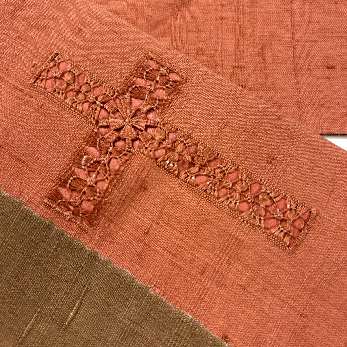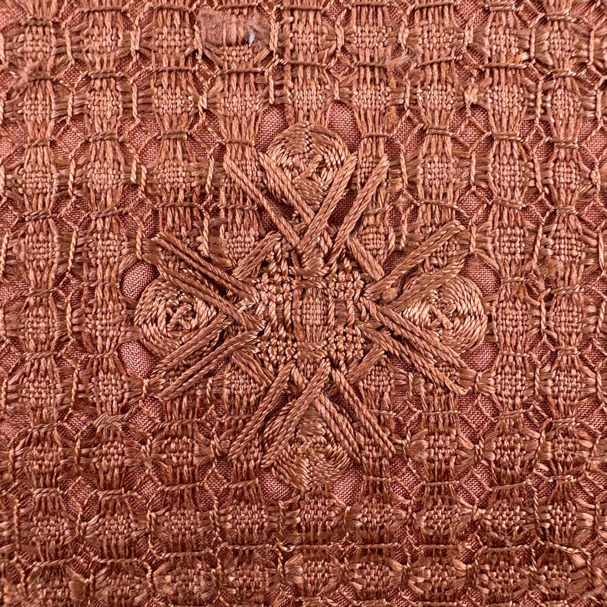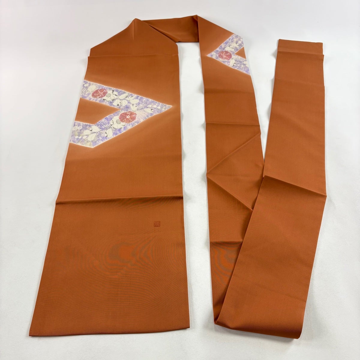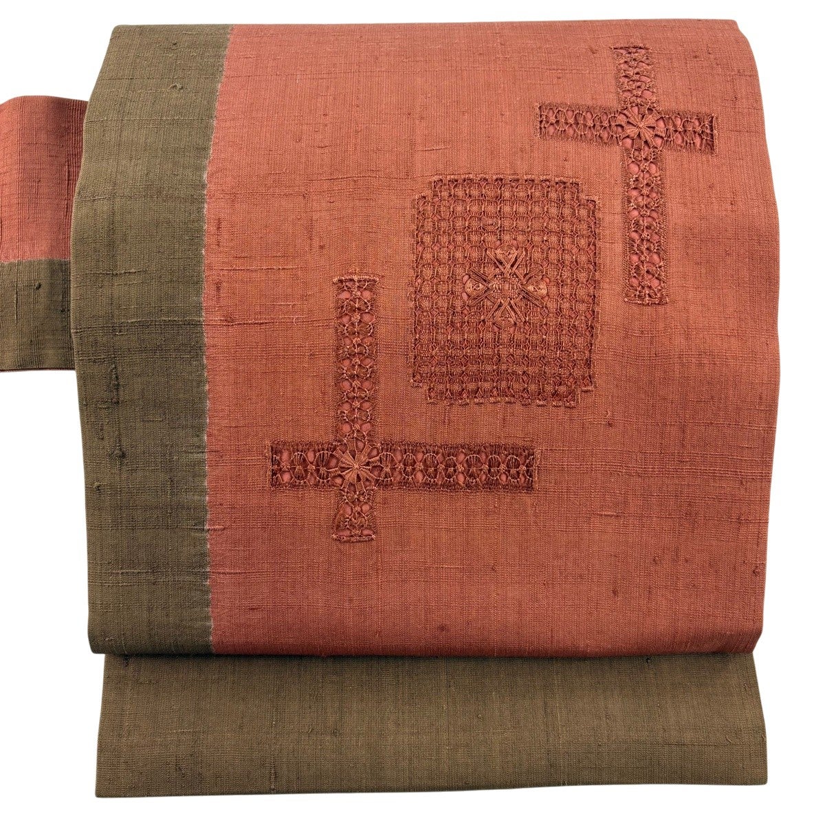 【美品】 名古屋帯 秀品 紬地 花 幾何学模様 刺繍 絞り 赤茶 正絹