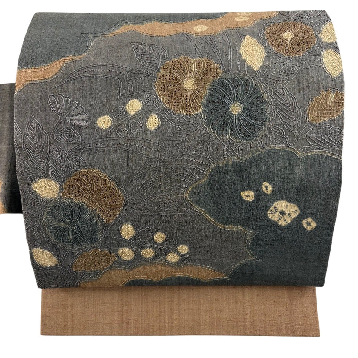 【美品】 名古屋帯 秀品 紬地 草花 雲文 刺繍 絞り 灰緑 正絹