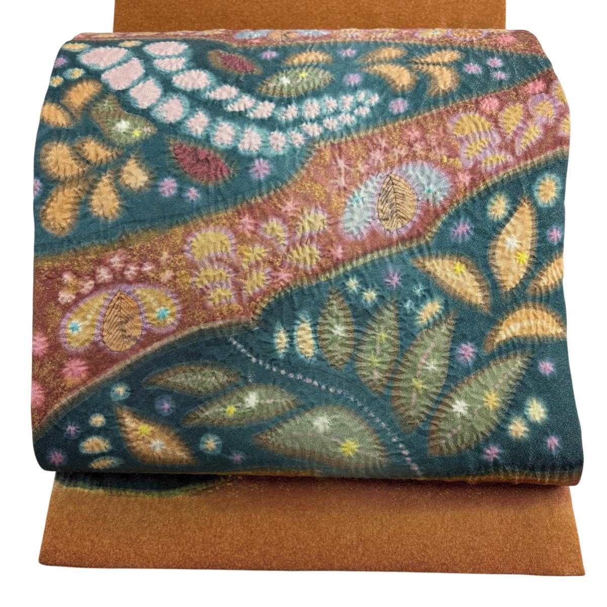 【美品】 名古屋帯 秀品 紬地 花 幾何学模様 刺繍 絞り 赤茶 正絹