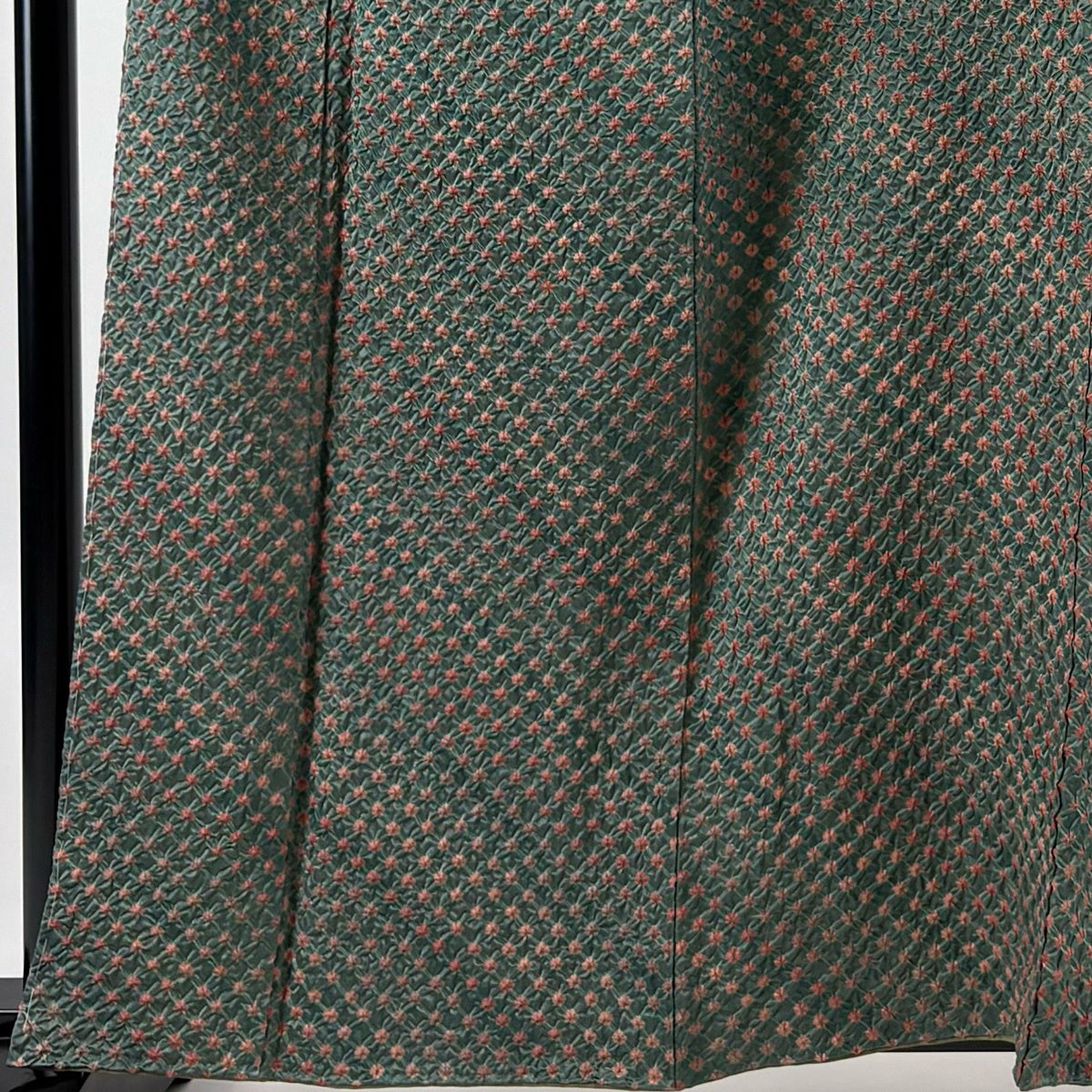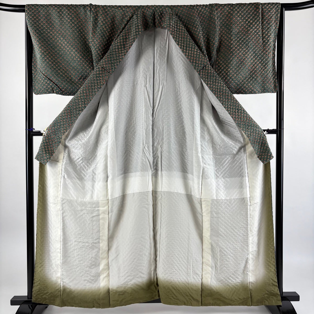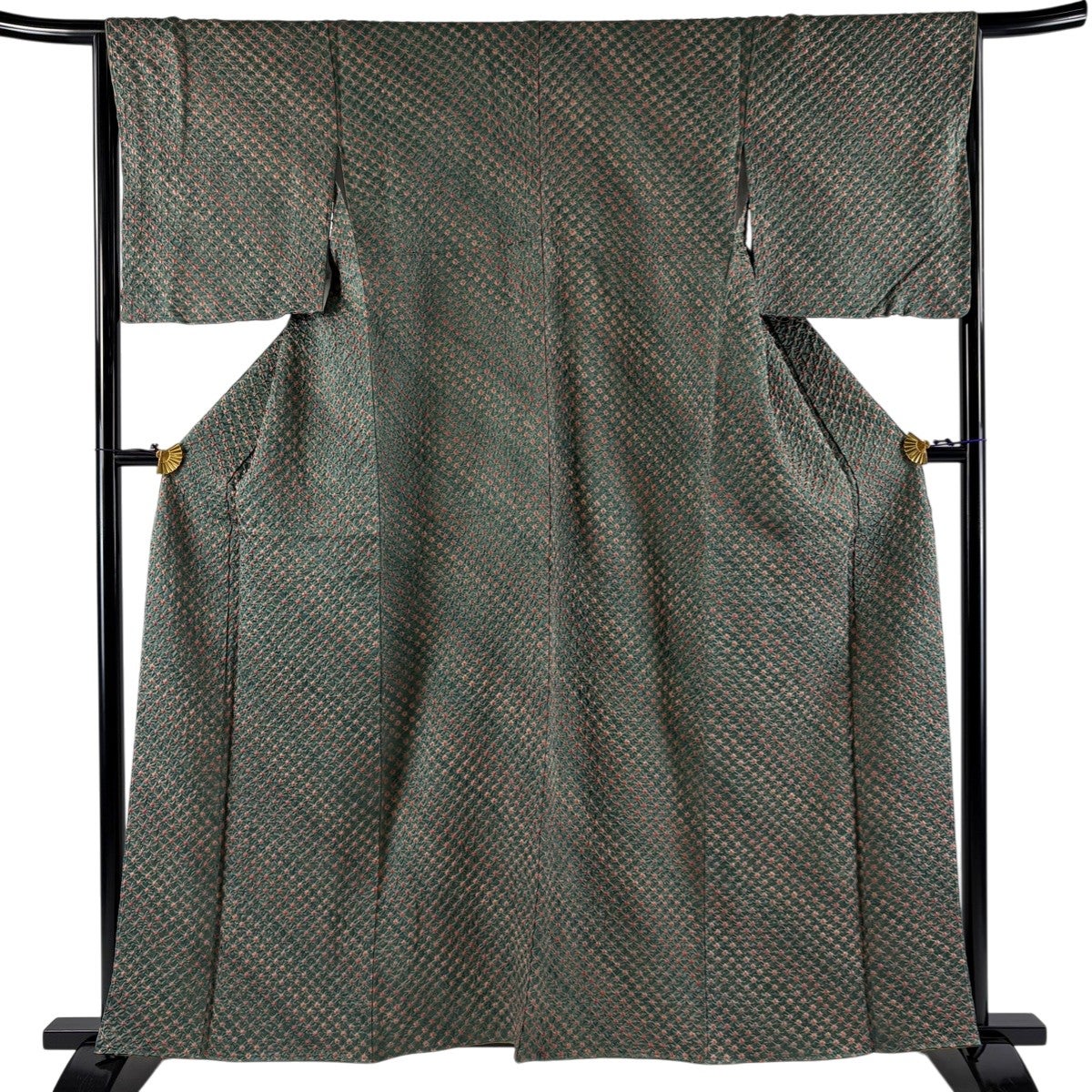 小紋 身丈156cm 裄丈66.5cm M 袷 桔梗 流水 金彩 絞り 鶯色 正絹 秀品