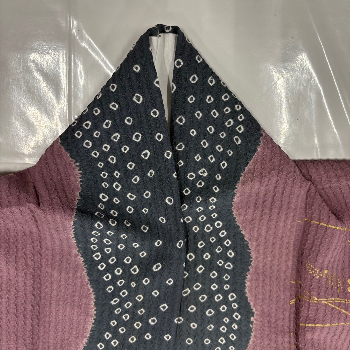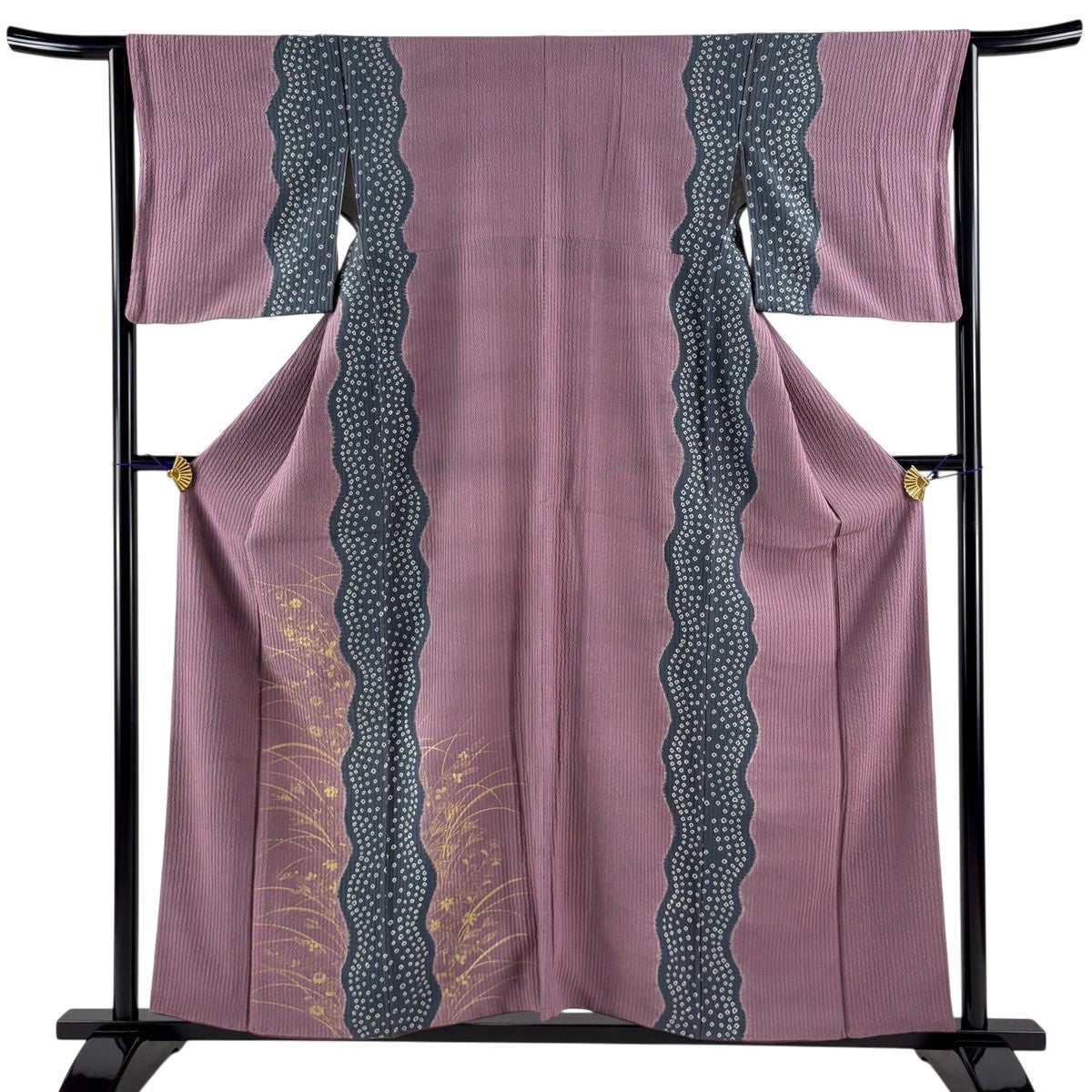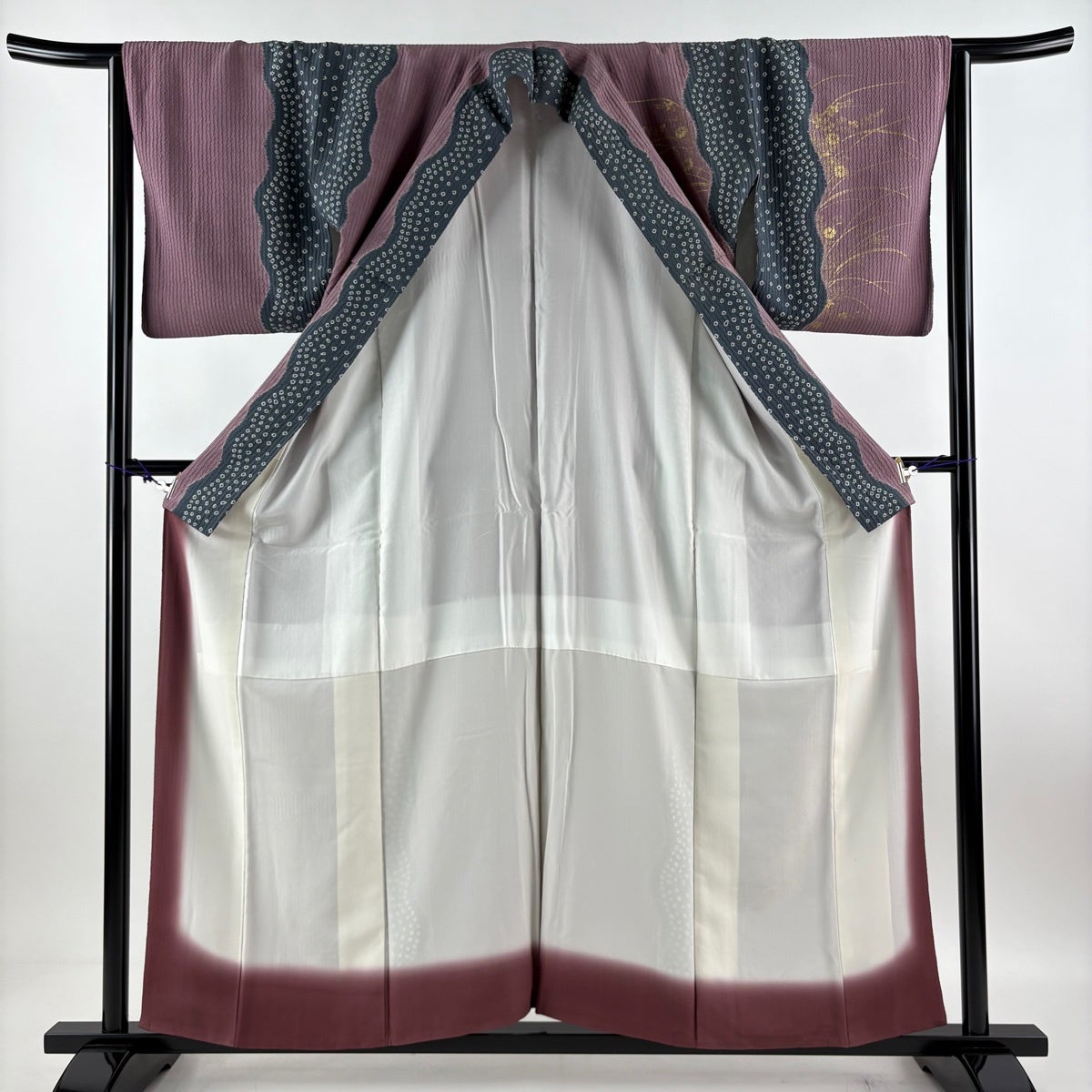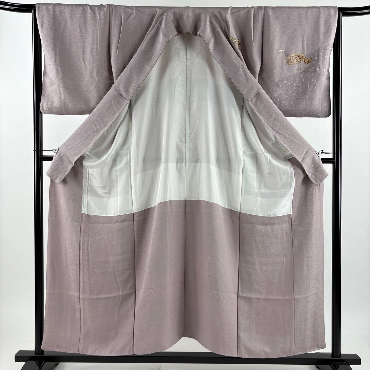 付下げ 身丈157cm 裄丈64cm M 袷 草花 よろけ縞 金彩 絞り 灰紫 正絹 秀品