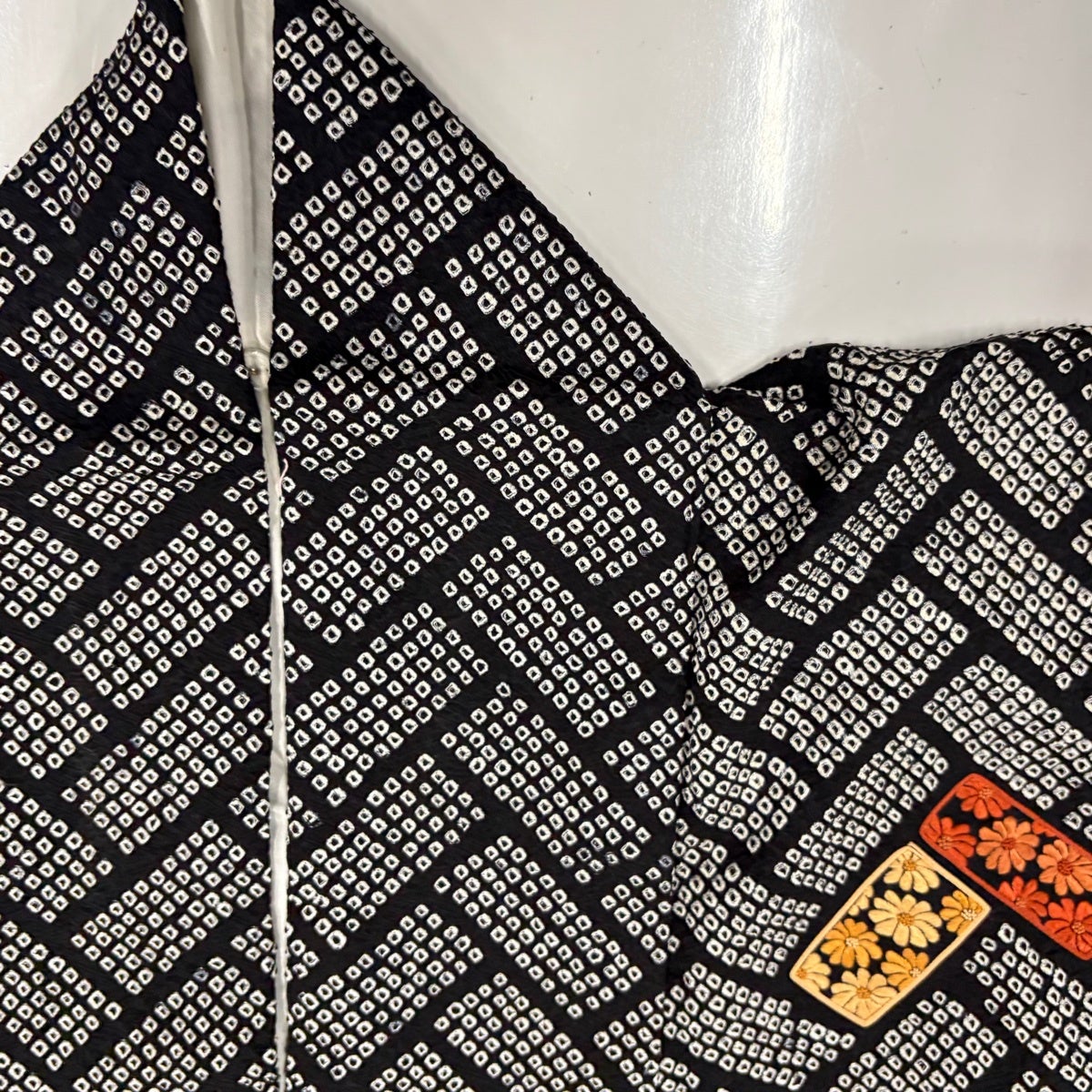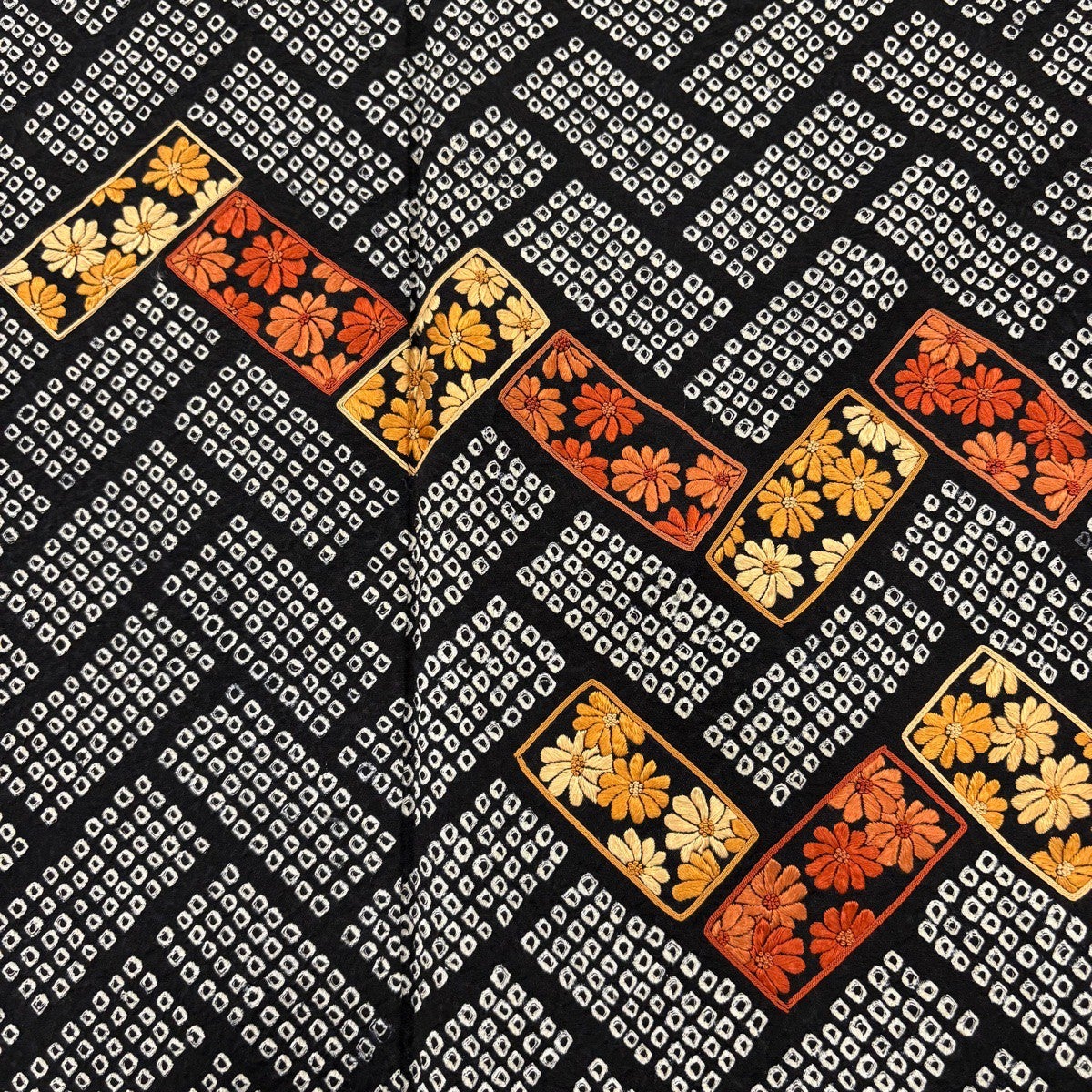 【美品】 付下げ 身丈157cm 裄丈66cm M 袷 花 桧垣 刺繍 絞り 黒 正絹 秀品